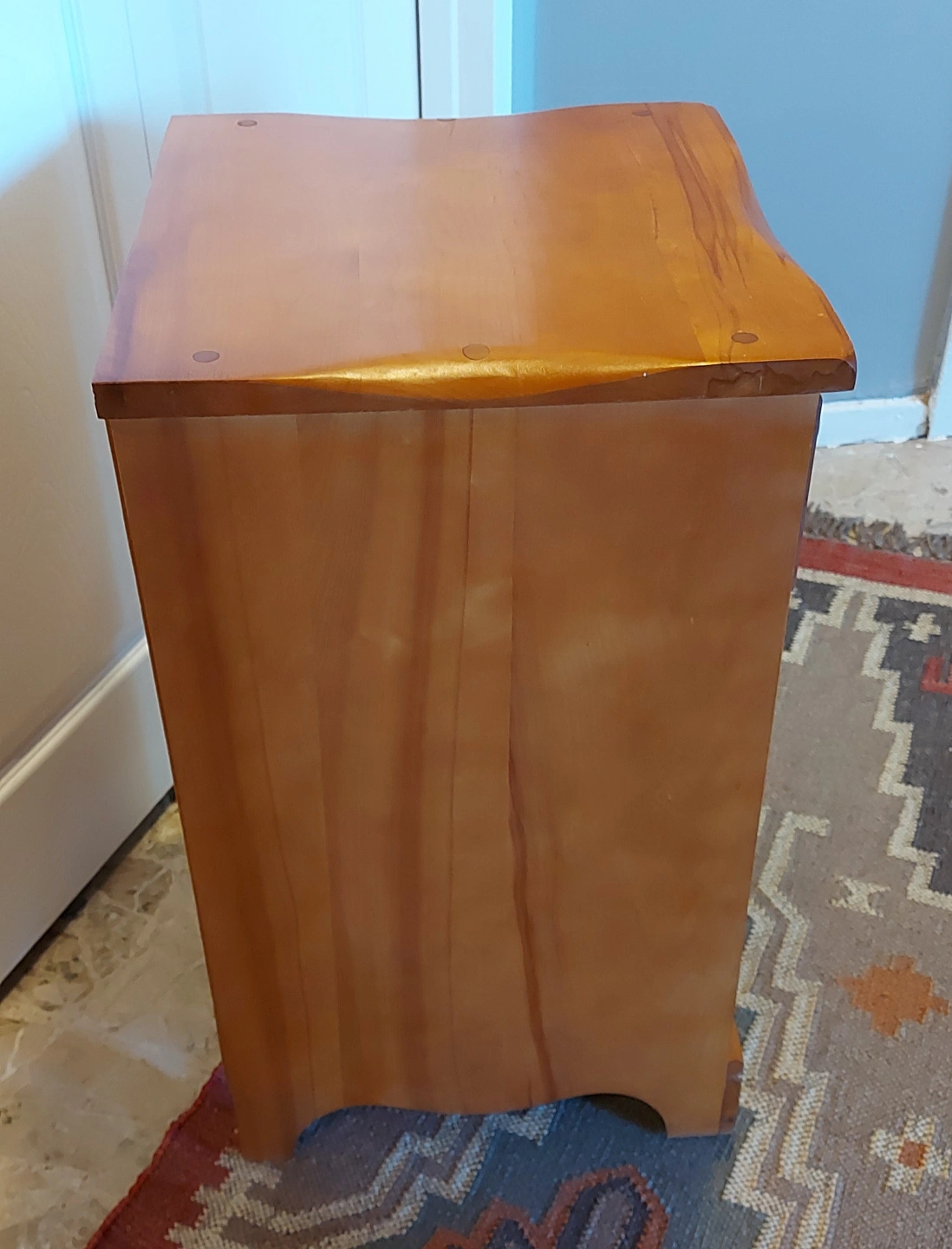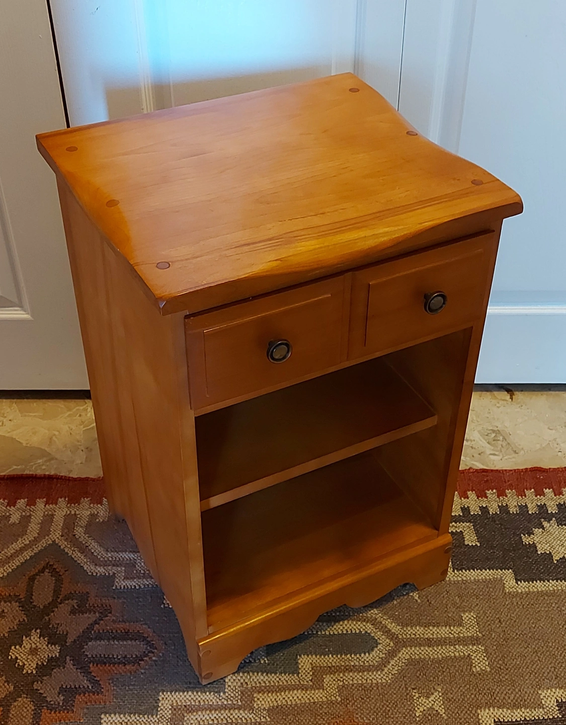 Vintage wooden bedside table with one drawer and two open shelves. Features a curved top, perfect for placing a lamp. You can easily create a peaceful sanctuary with this lovely piece in very good condition.