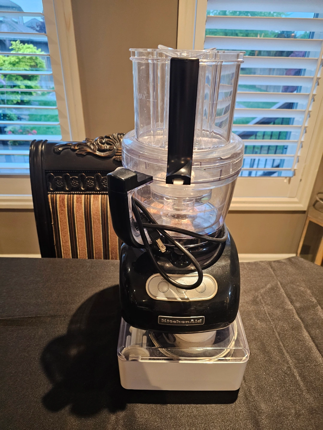 A food processor. Black and clear. Would be a perfect addition to your culinary creations, making food preparation a breeze.