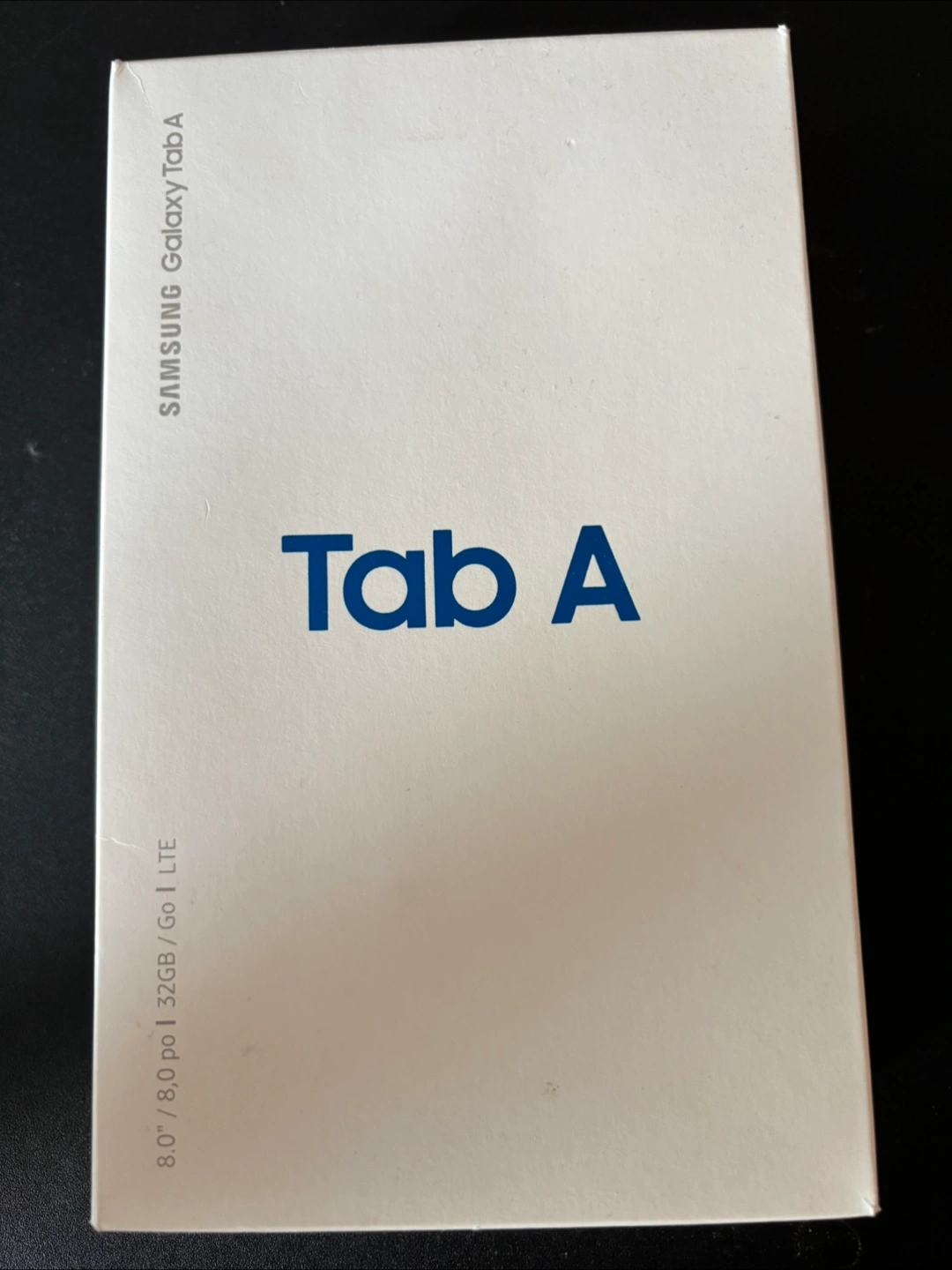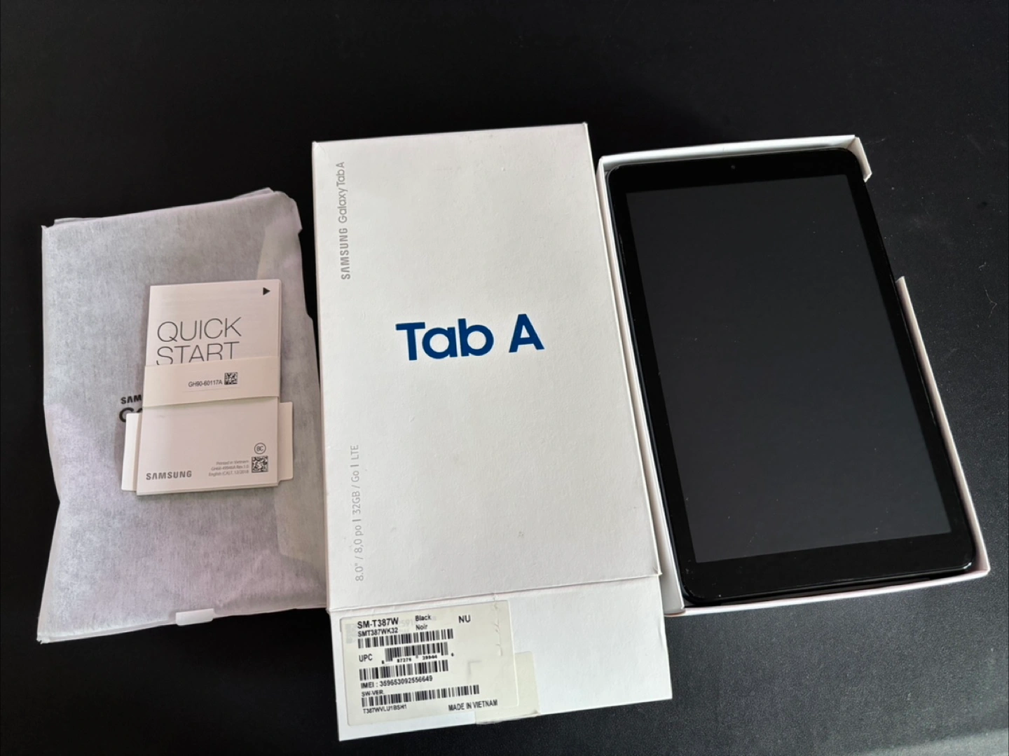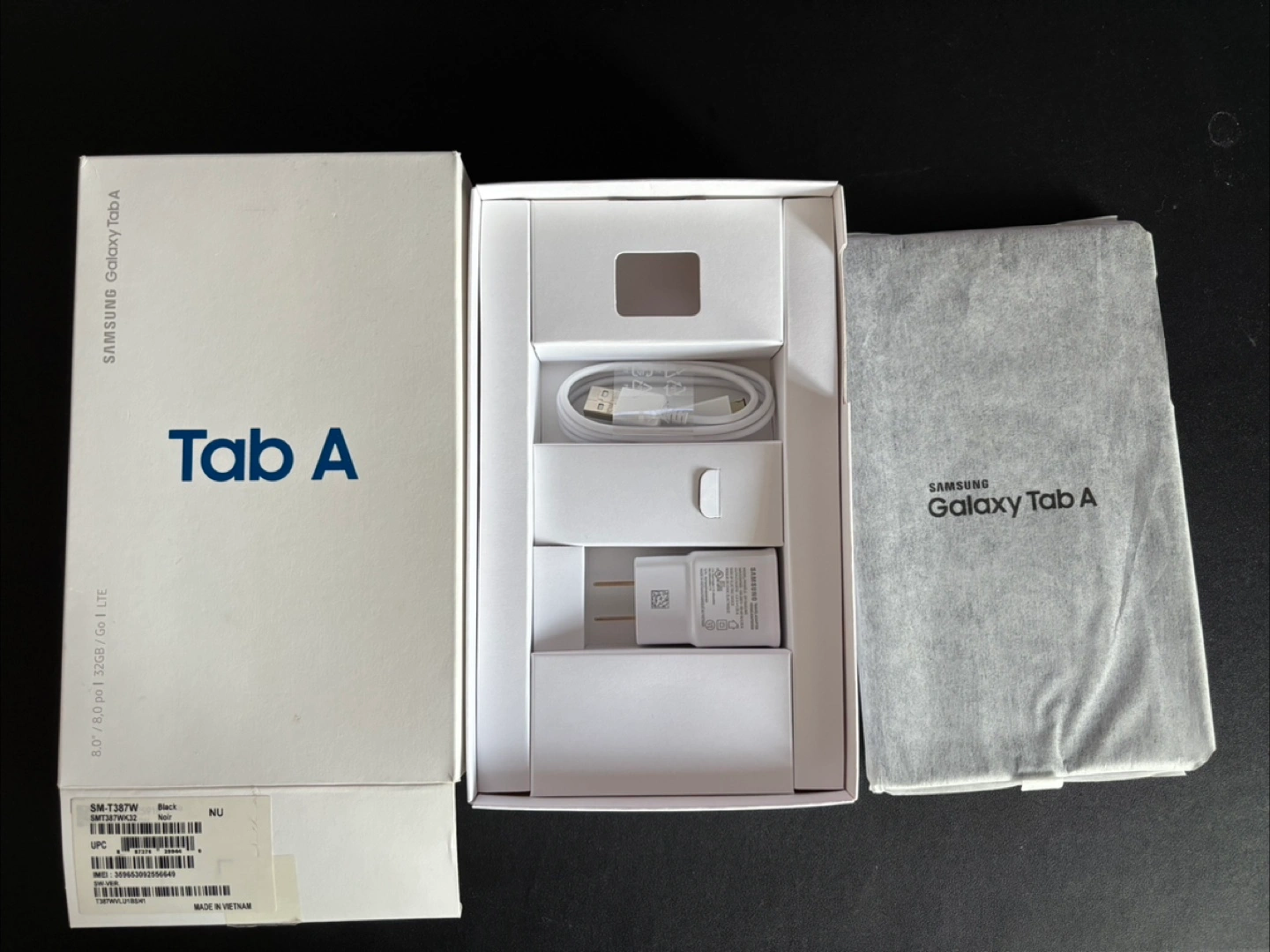 Tablet with original box and accessories. Included are charging cable, adapter, and quick start guide. Comes with a case for safe storage.