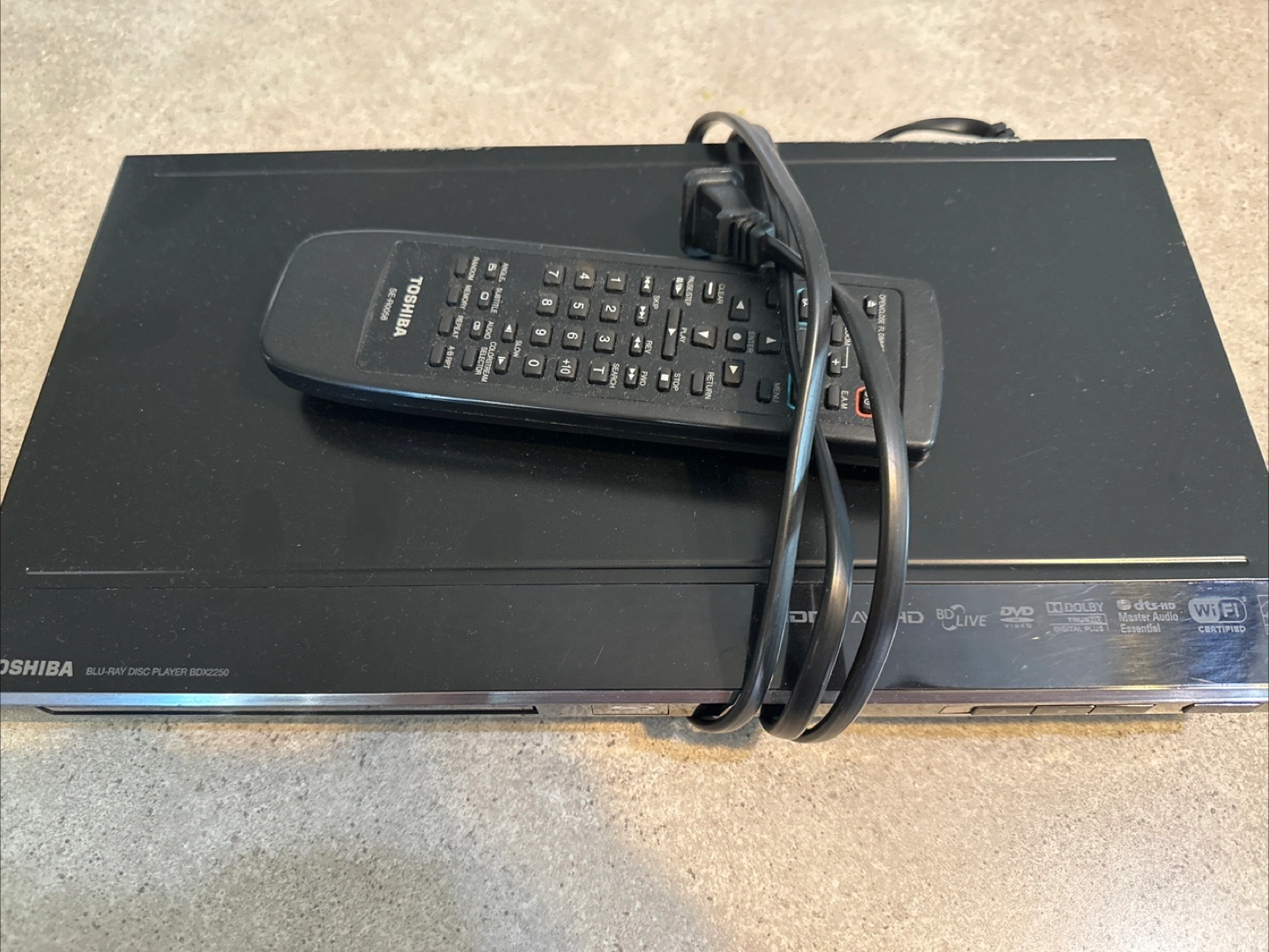 Black-coloured Blu-Ray player with its original remote. A power cable is connected. This is the perfect way to wind down at the end of a long day.