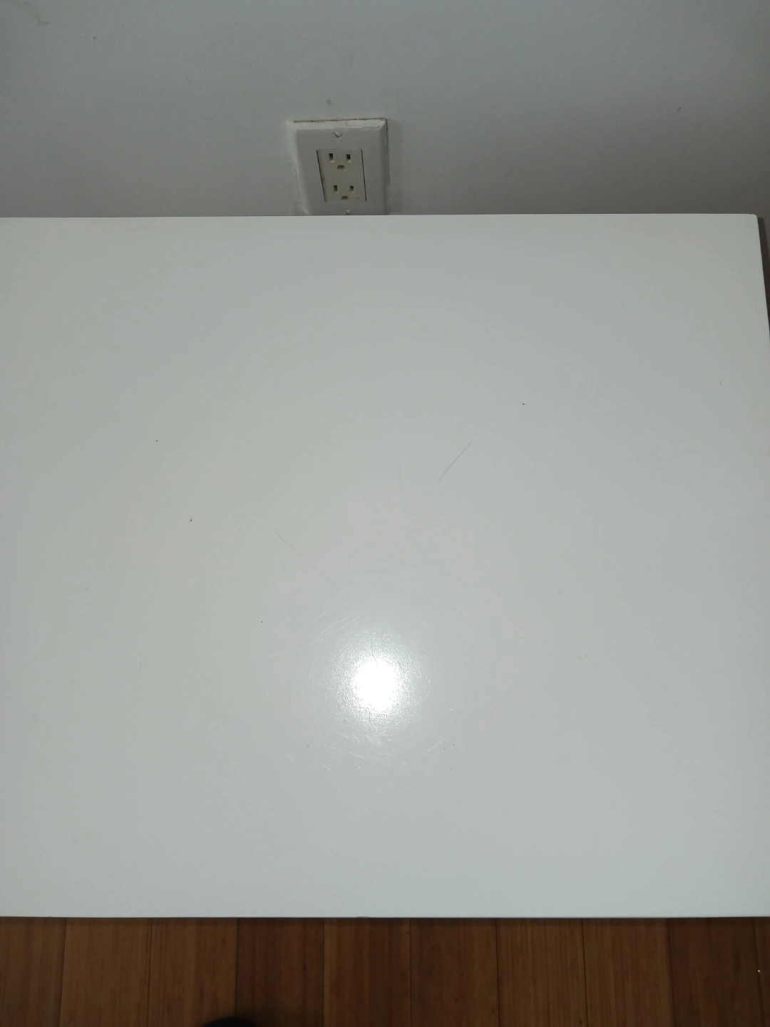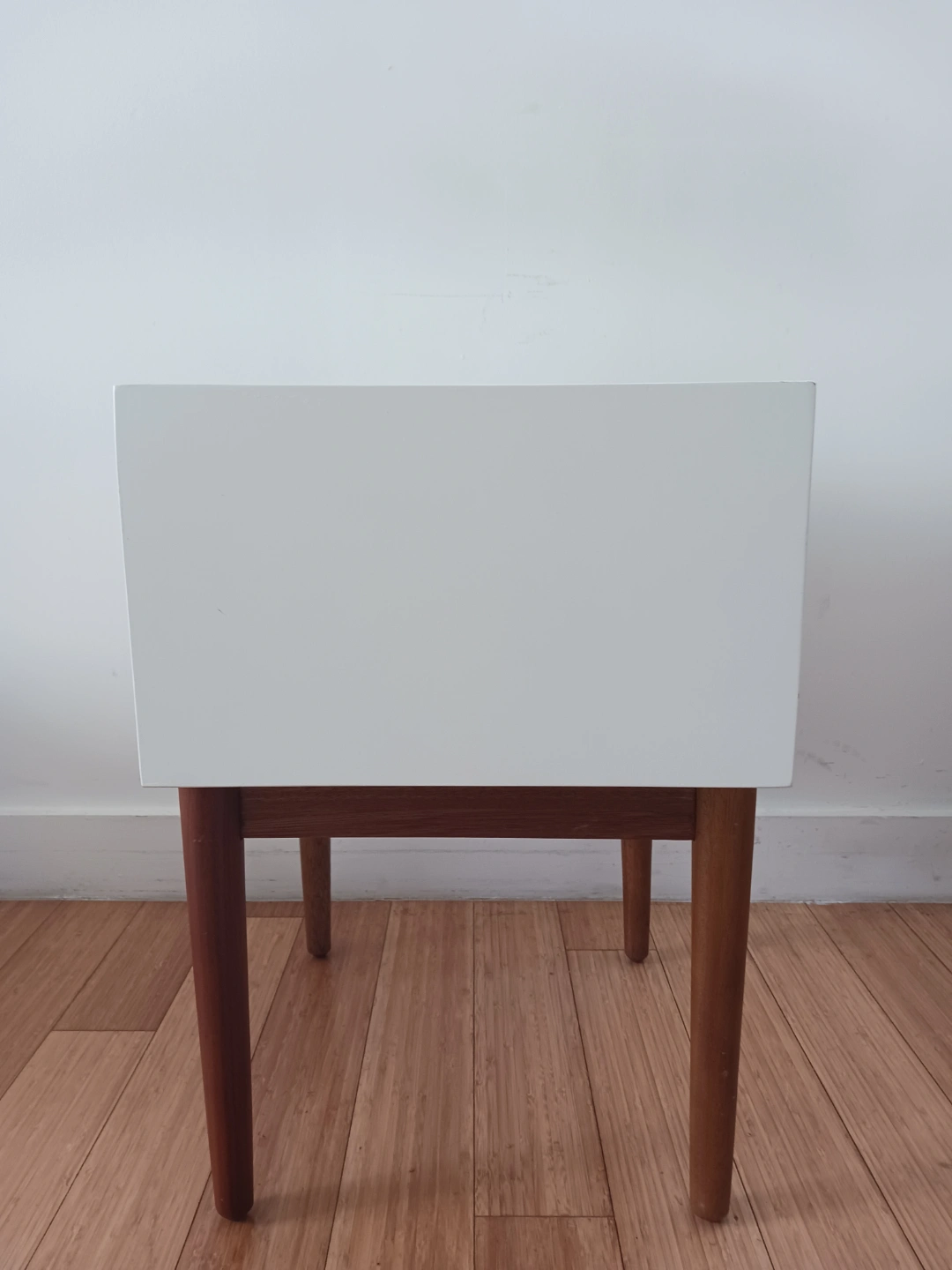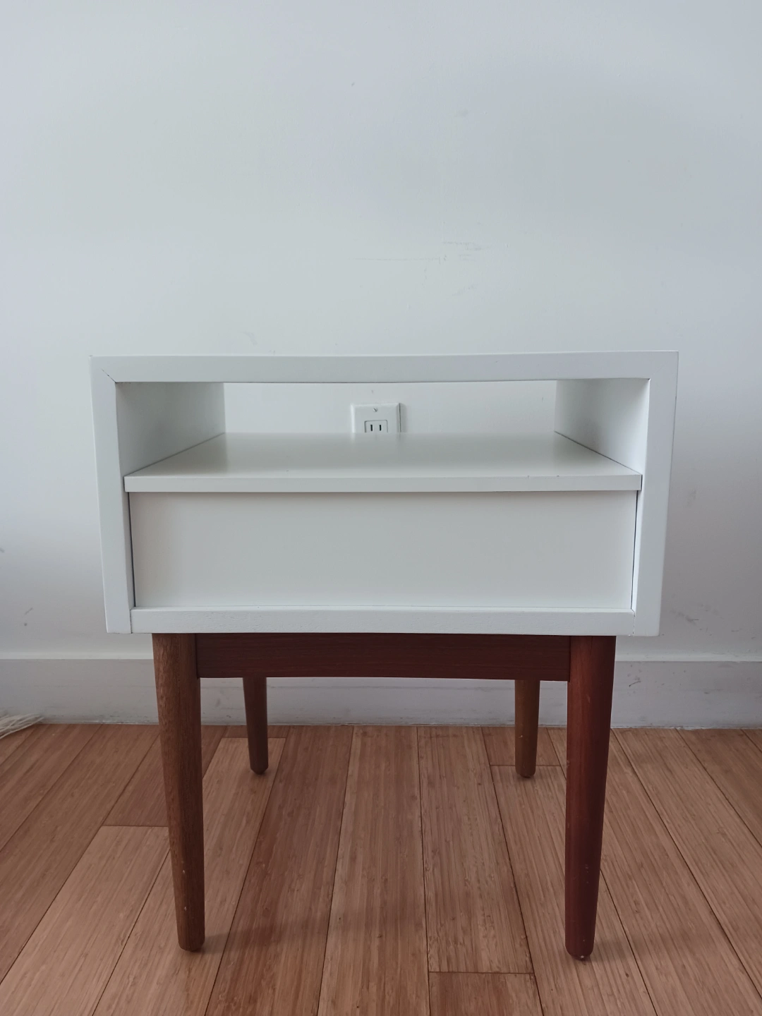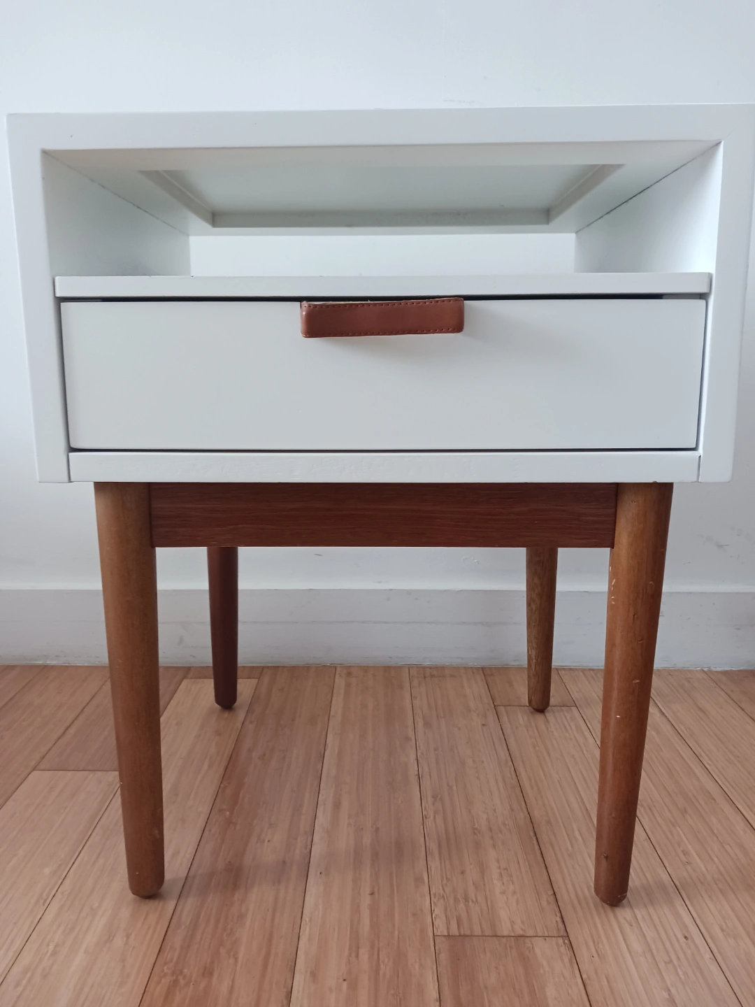 White nightstand. Features a drawer with a leather pull. Has wooden legs. A great spot to place a lamp and your nighttime reads, for a restful sleep.