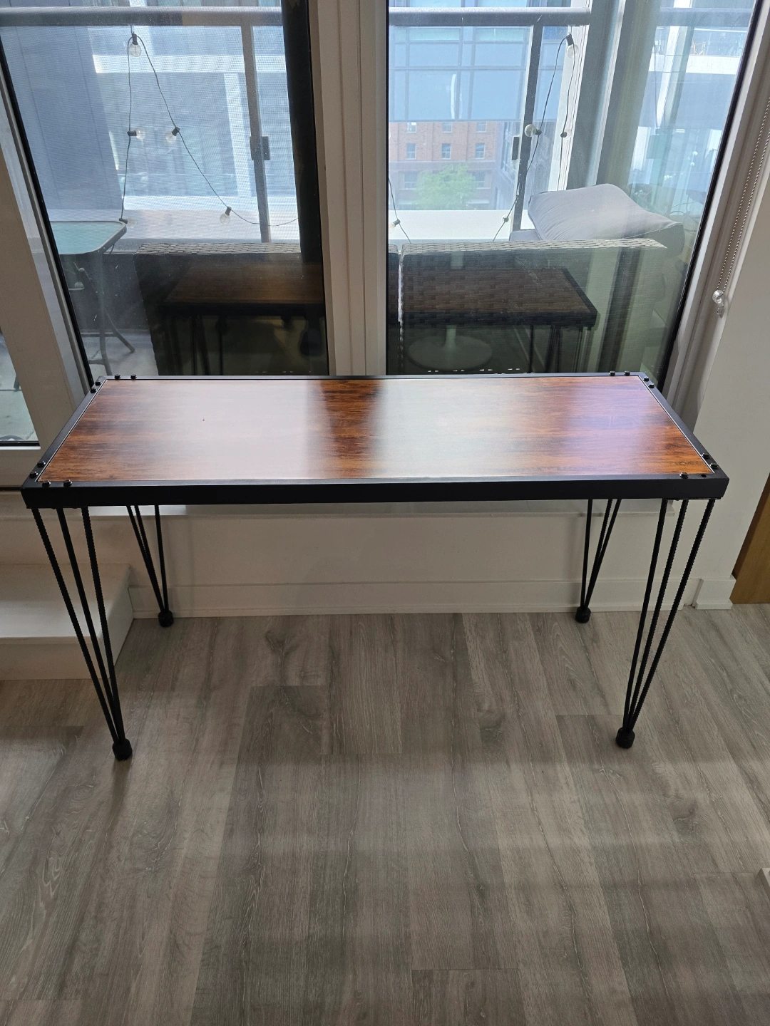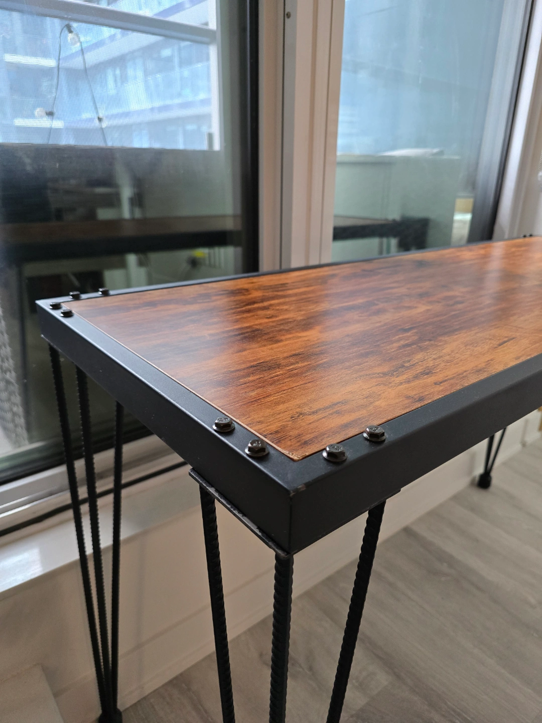 Pre-loved console table with a distressed vibe featuring a sturdy metal framed border with a burnt wood color table top. Its table top is supported on triple bar legs.