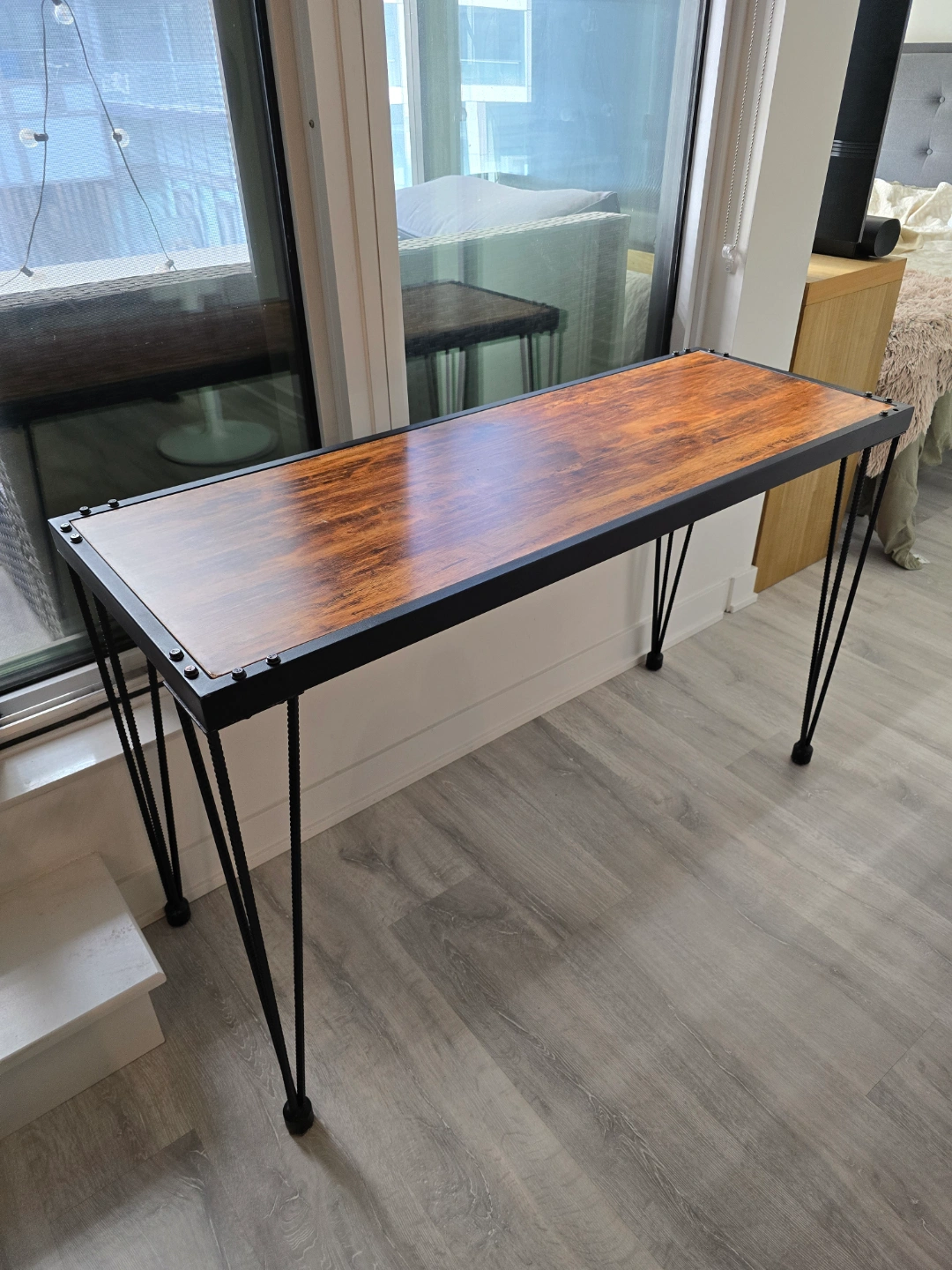 Pre-loved console table with a distressed vibe featuring a sturdy metal framed border with a burnt wood color table top. Its table top is supported on triple bar legs.