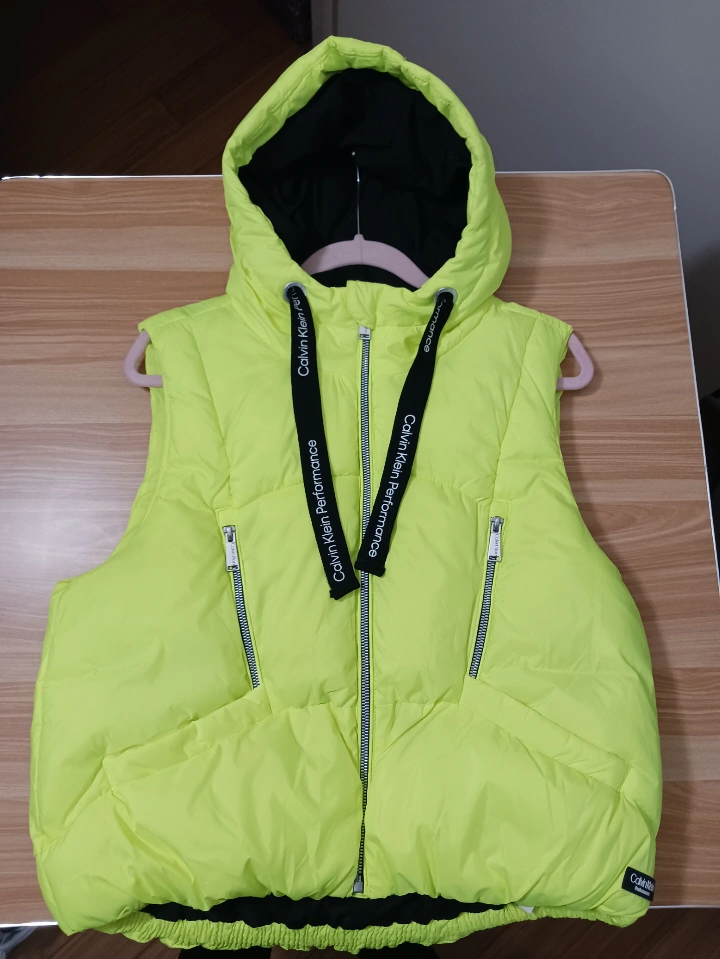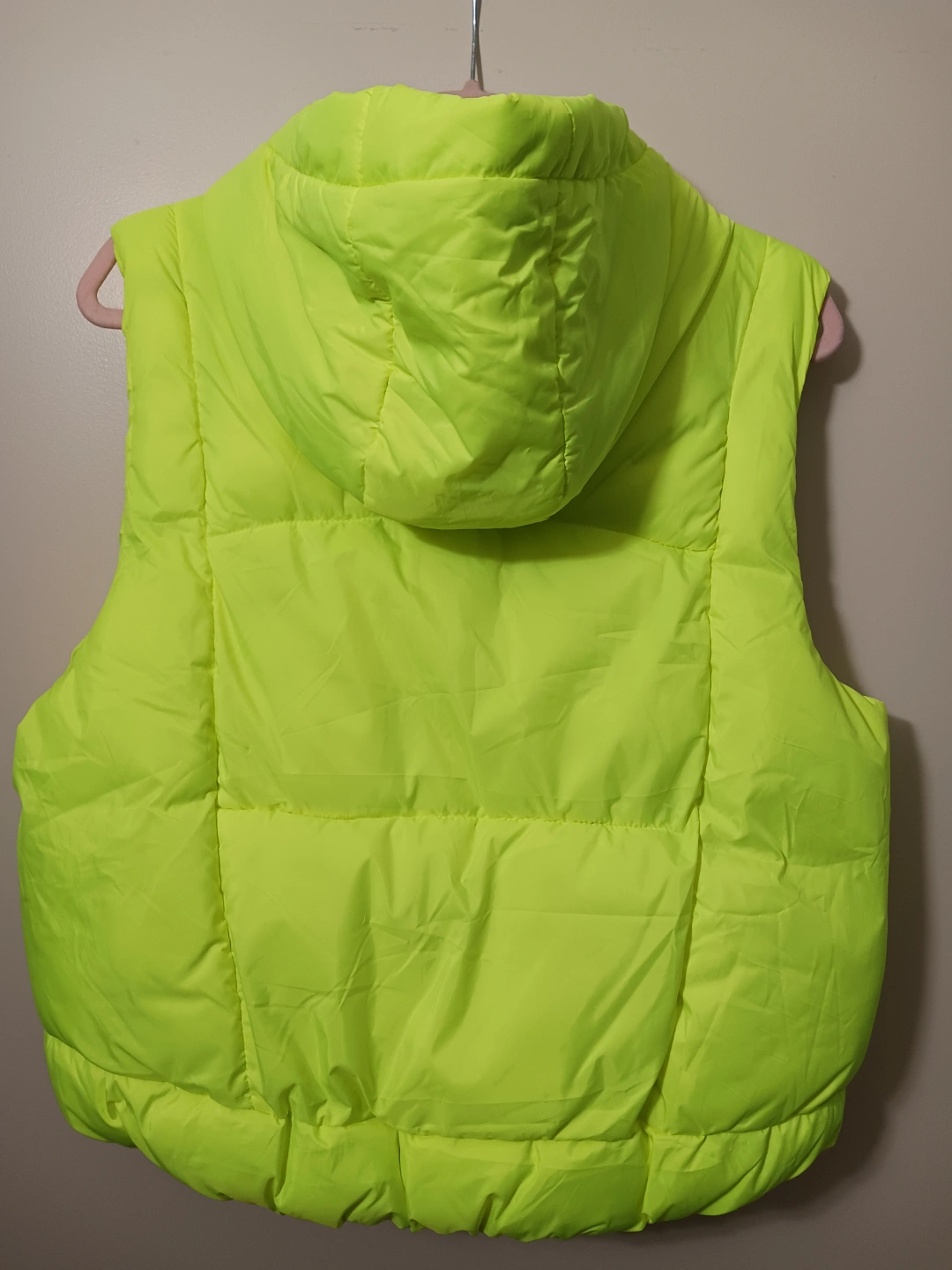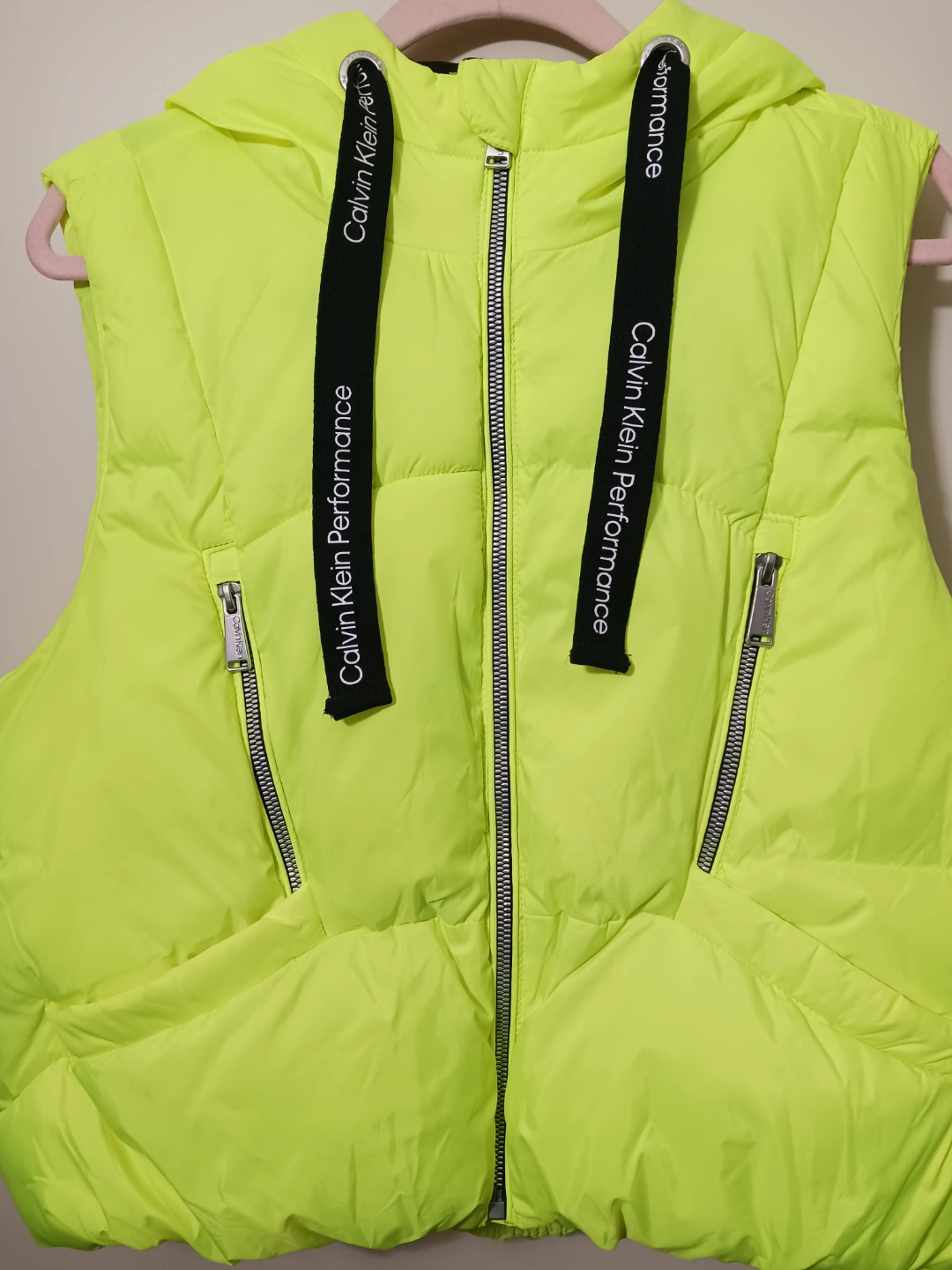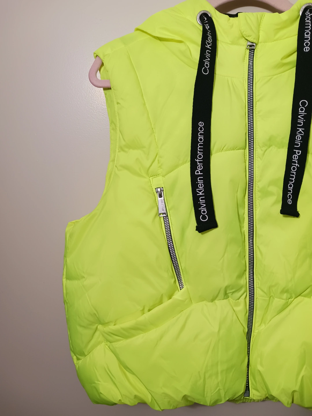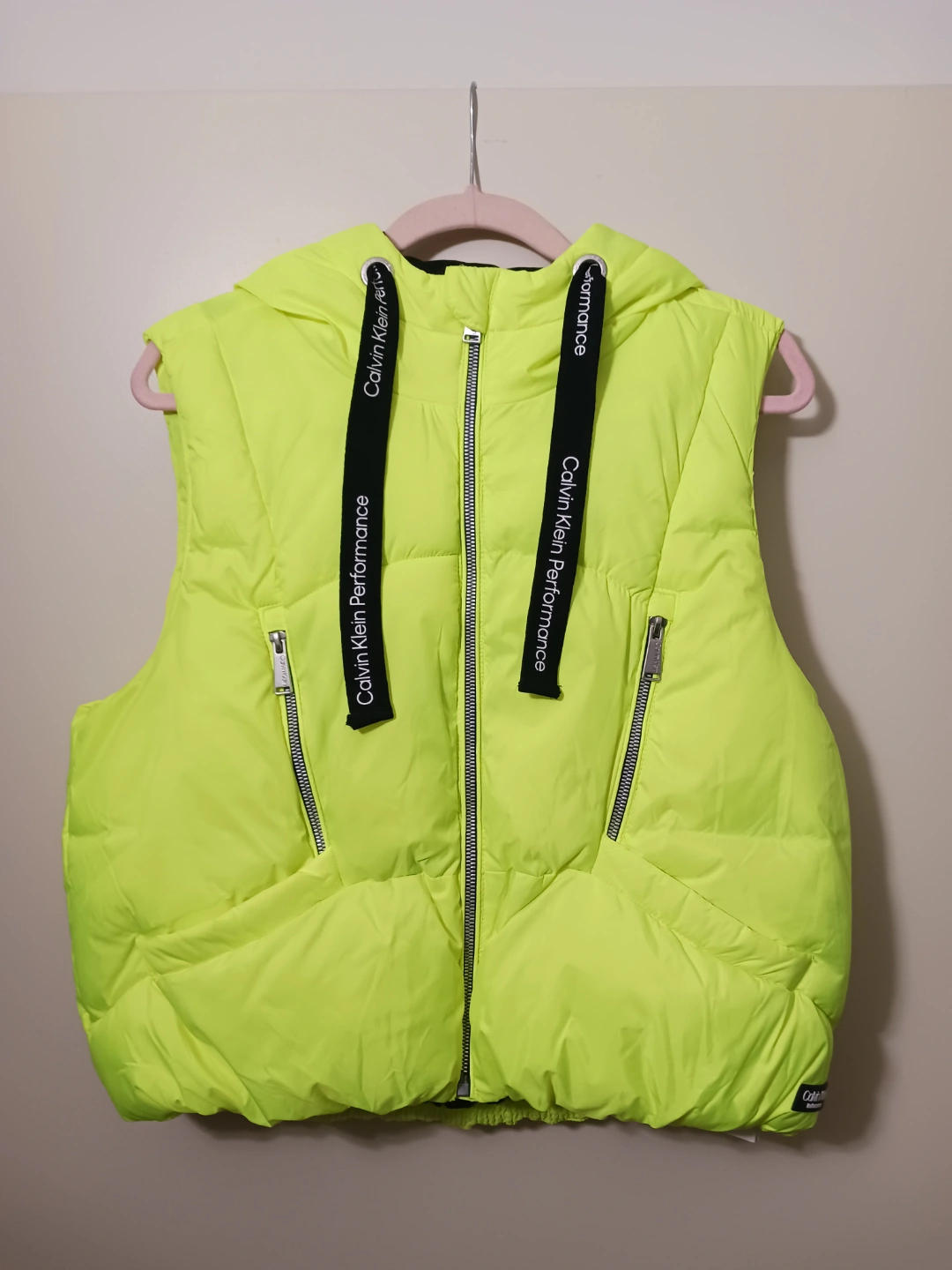 Bright yellow puffer vest. Features a hood. Black straps with brand name. Zipped pockets. Consider this vest as a cozy companion on a brisk walk.