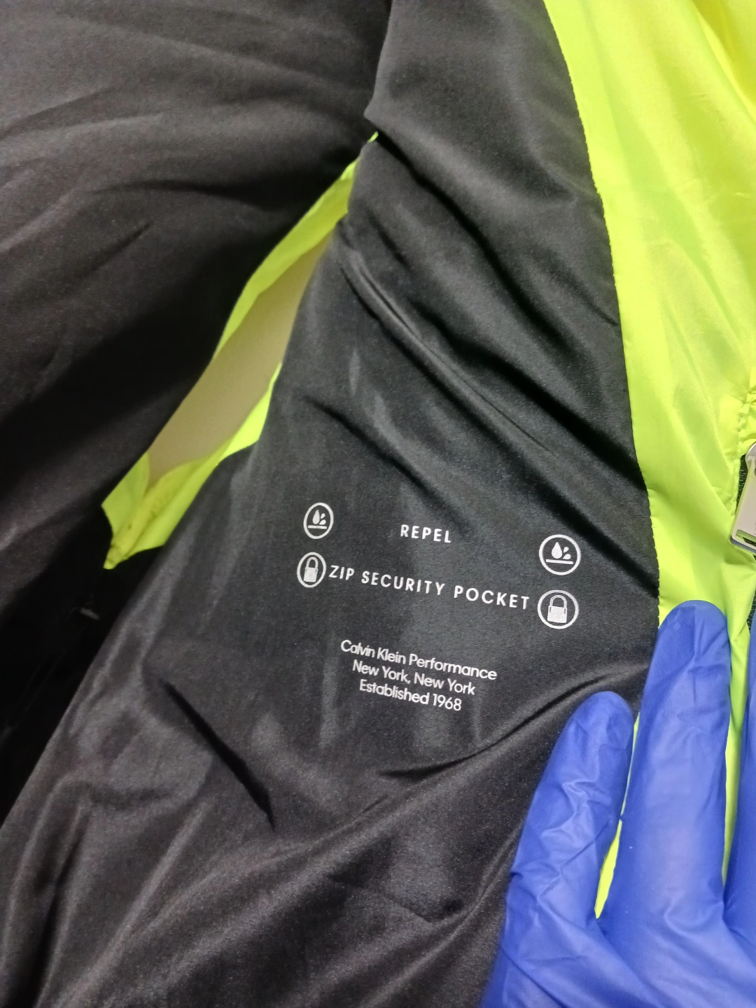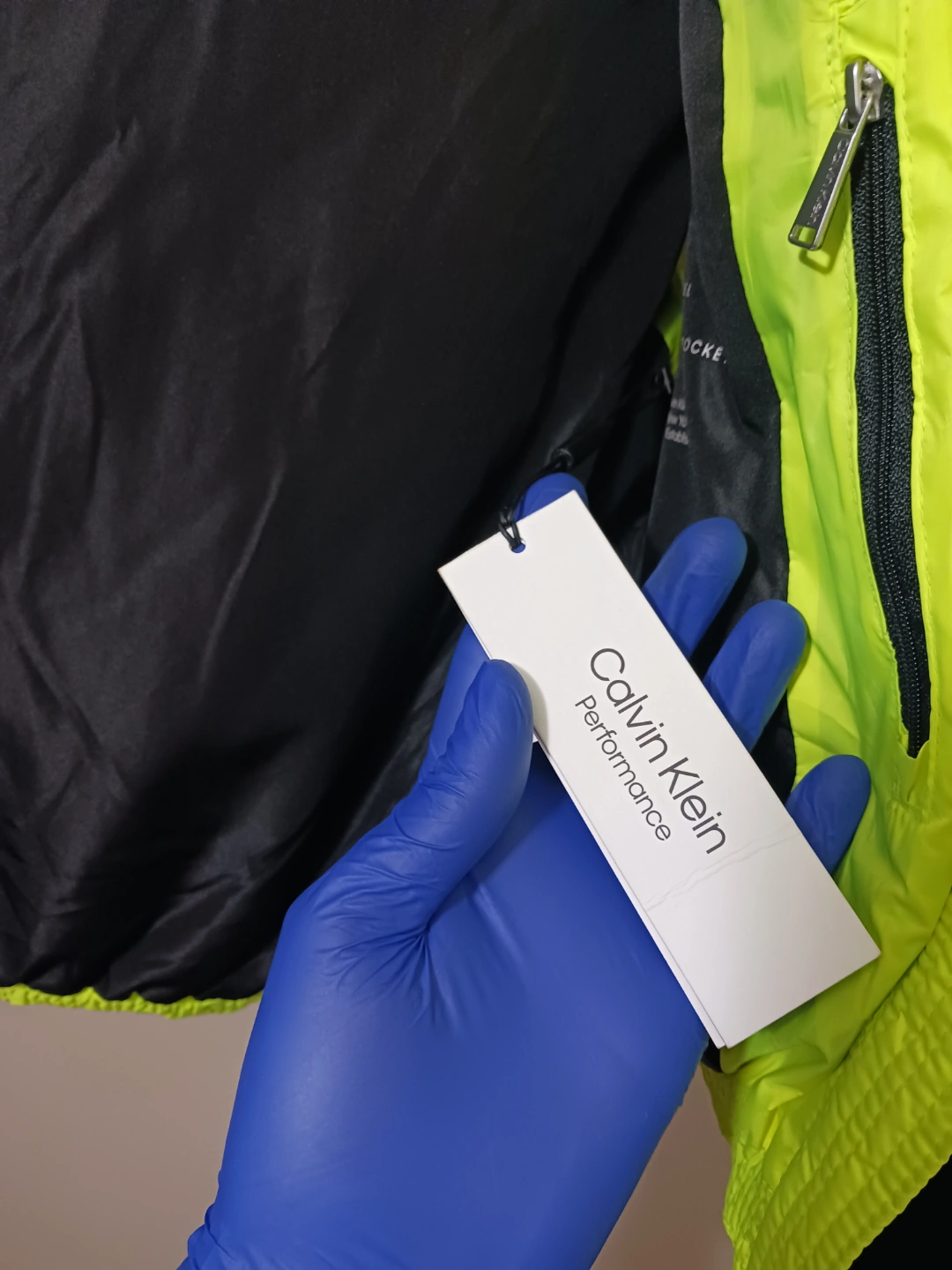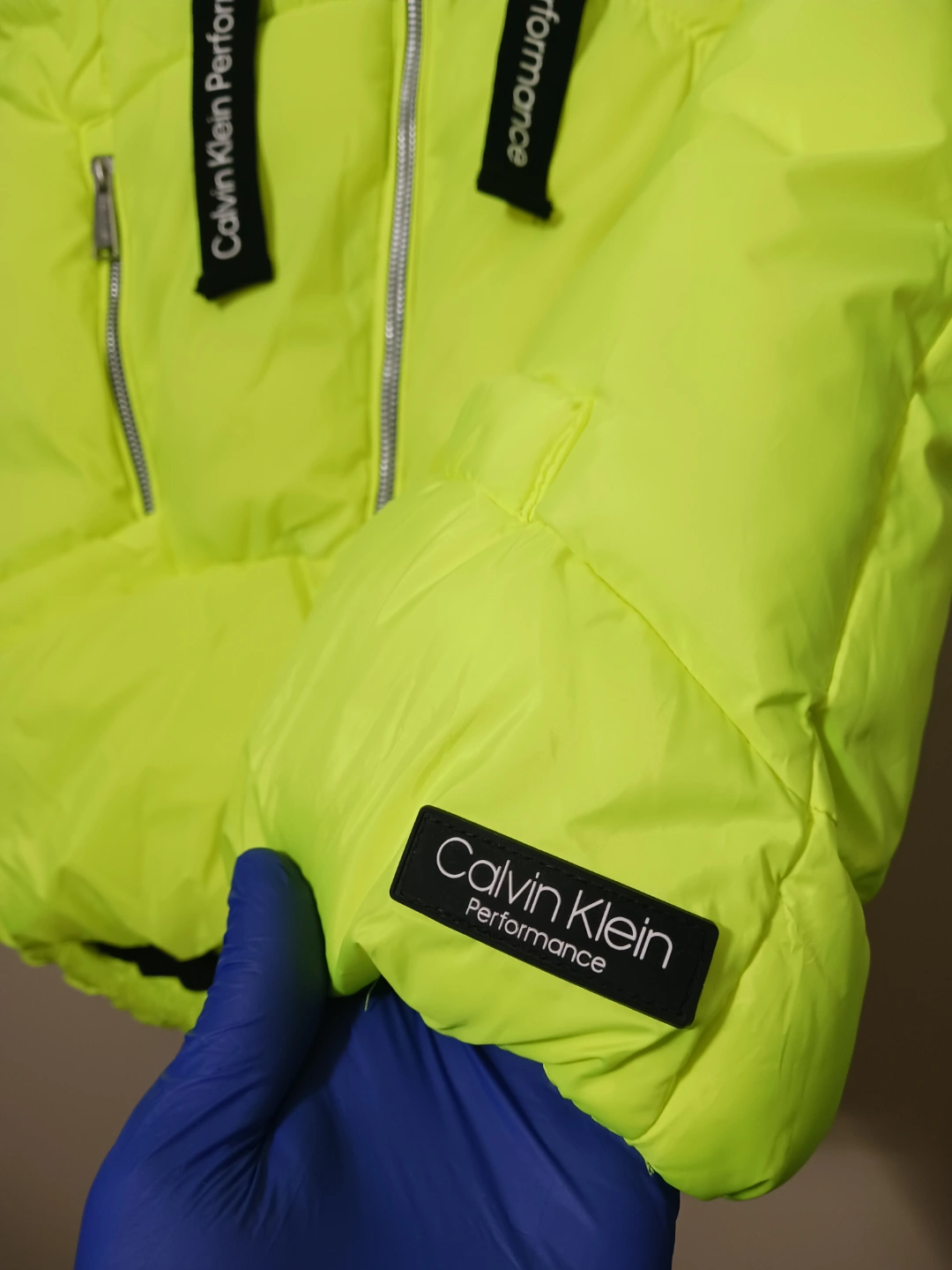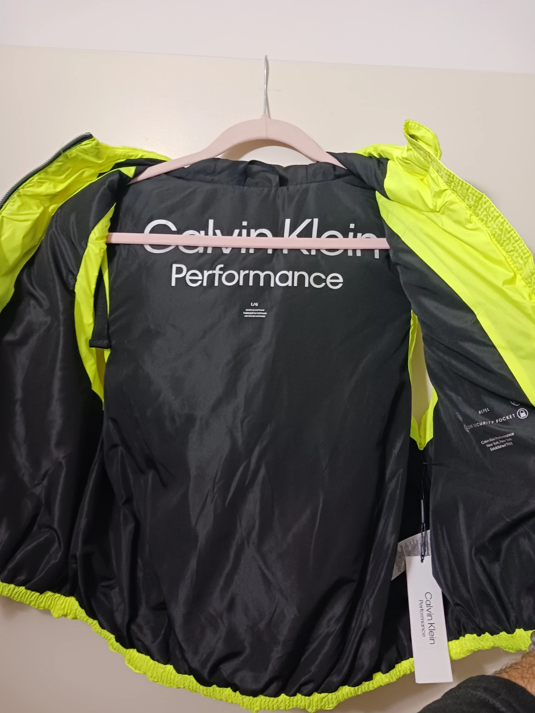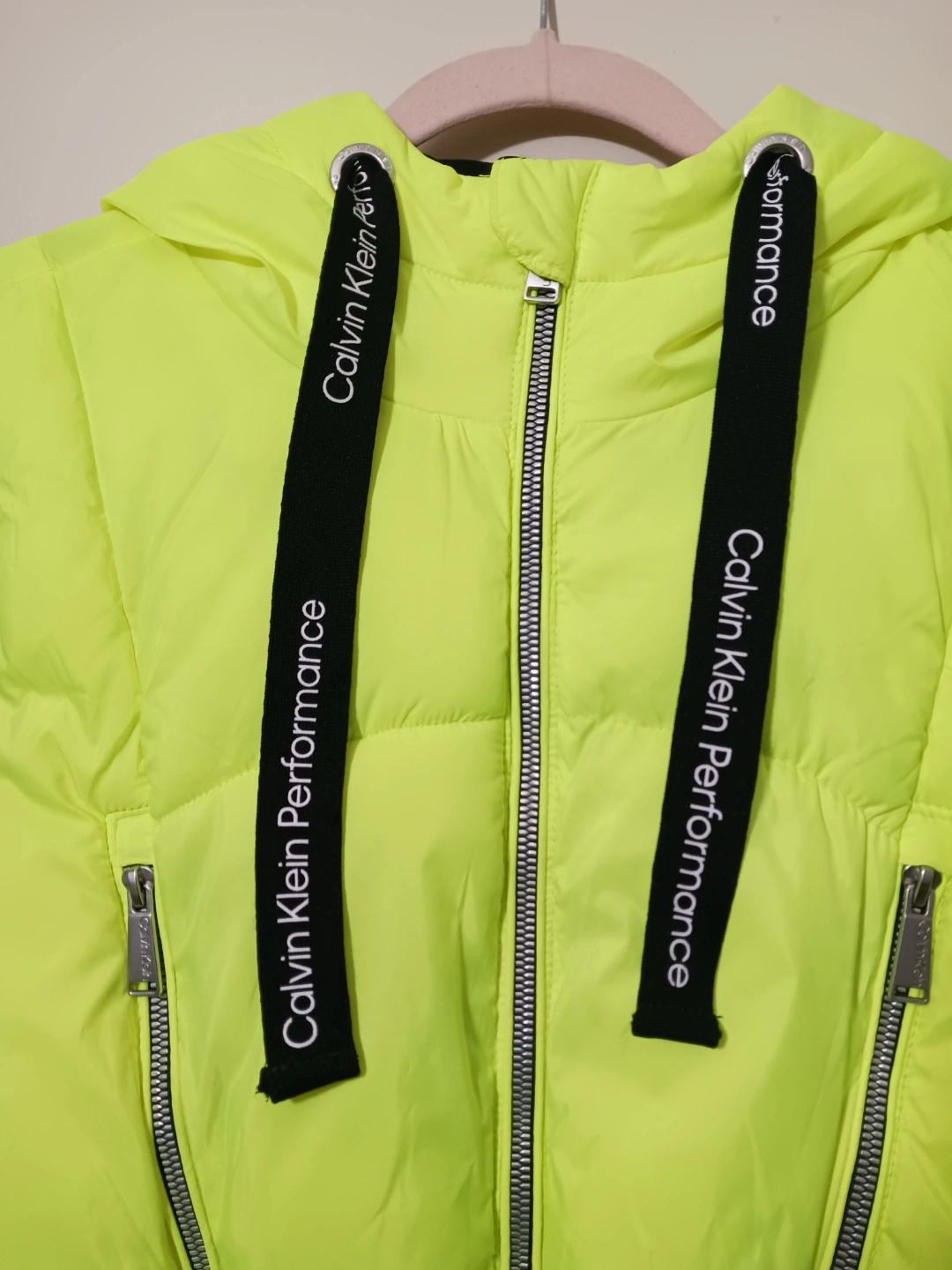 Bright yellow puffer vest. Features a hood. Black straps with brand name. Zipped pockets. Consider this vest as a cozy companion on a brisk walk.