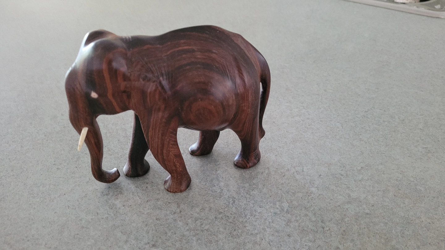 Wooden figurine. Carved elephant with tusks. Dark wood. Great addition to any room for a more tranquil environment.