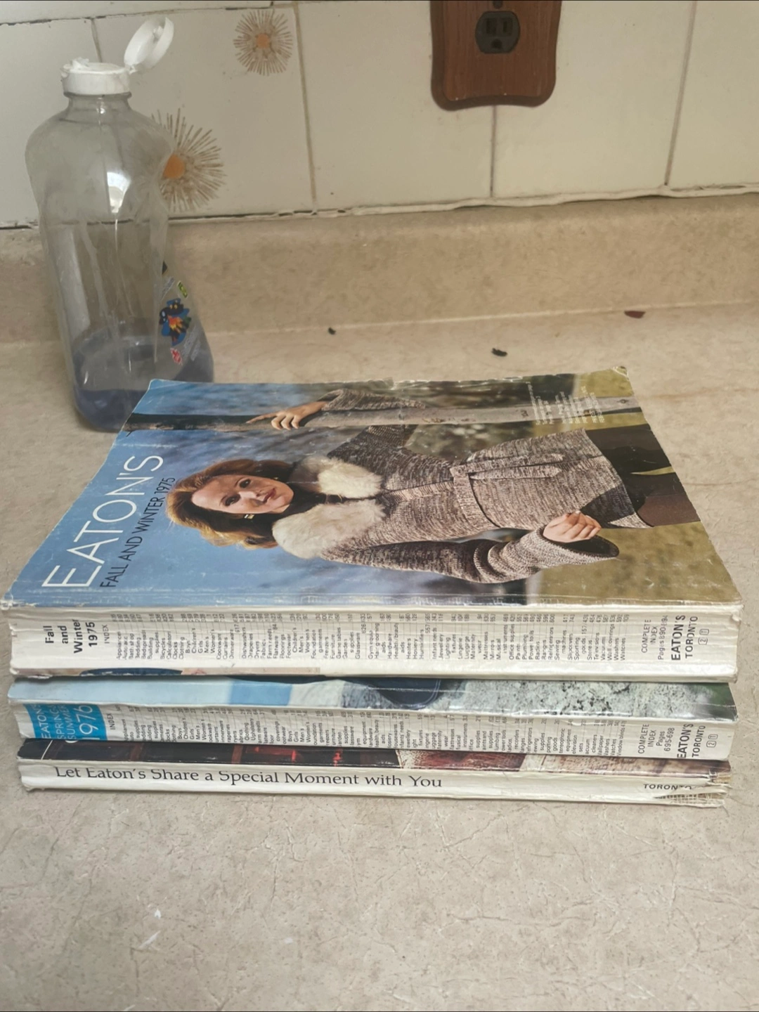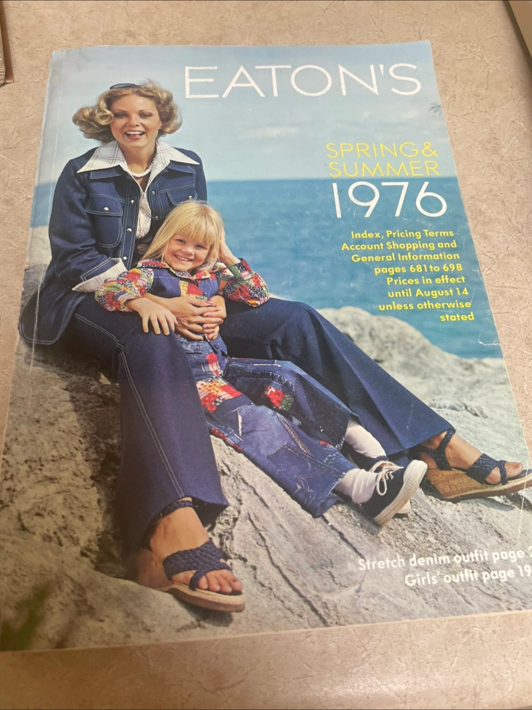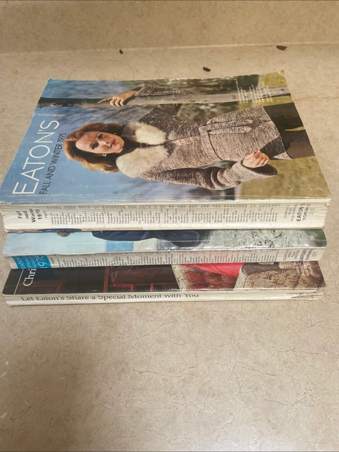 A stack of vintage Eaton's catalogues from 1976. Cover images show clothing and lifestyle scenes. With these catalogues, you could imagine yourself living in those times, even if just for a moment.