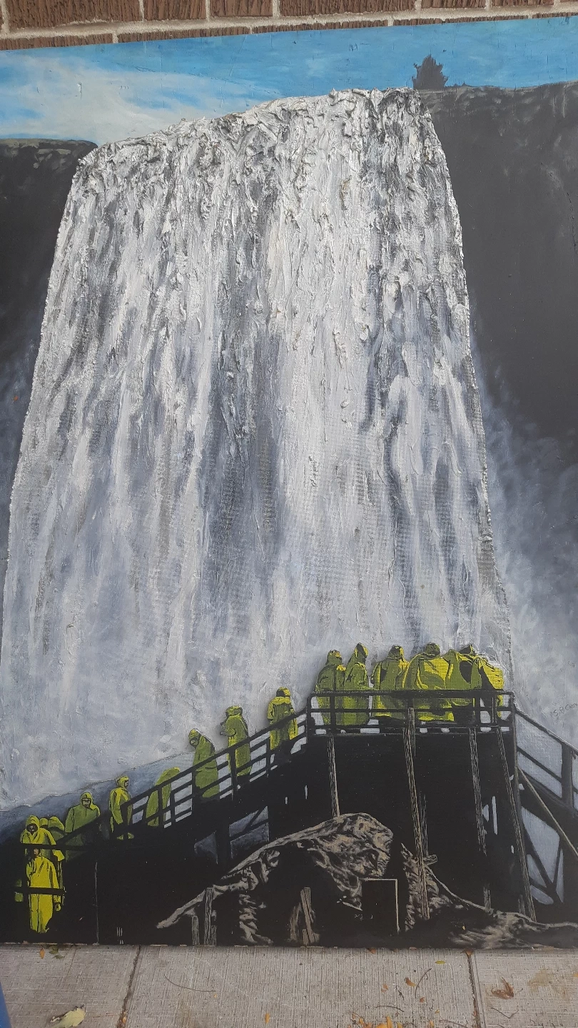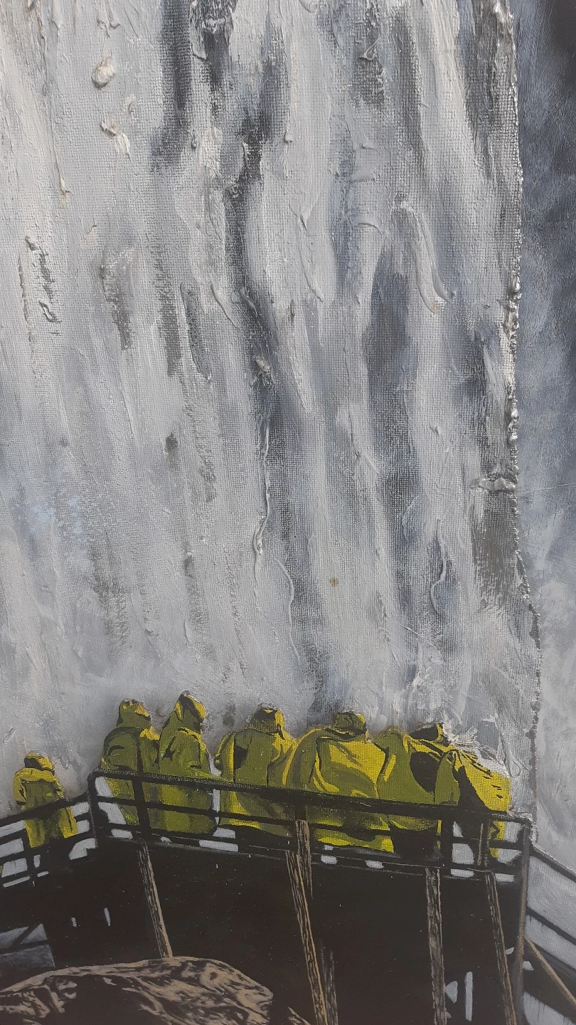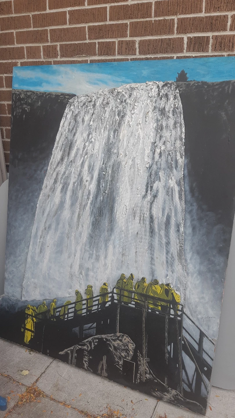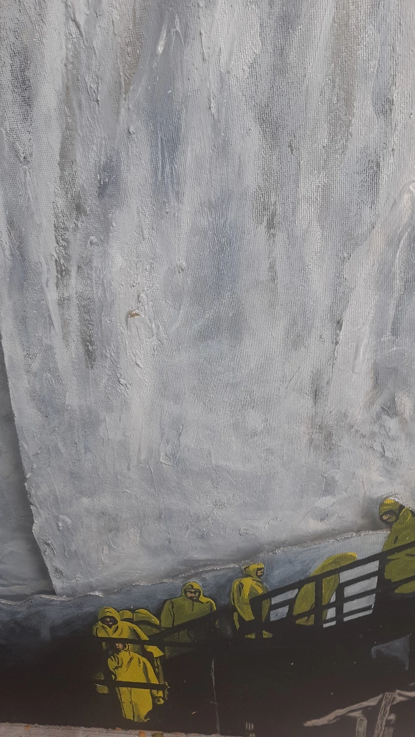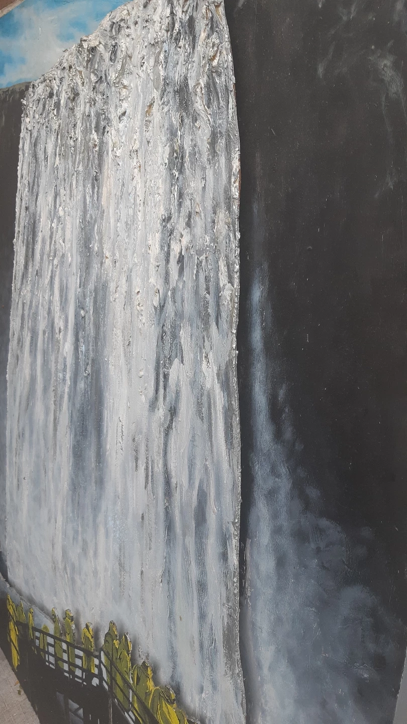 104Painting of a waterfall. Features the scene of a waterfall with a deck, and figures wearing yellow. It would be a great painting to hang and admire, letting your worries drift away.
