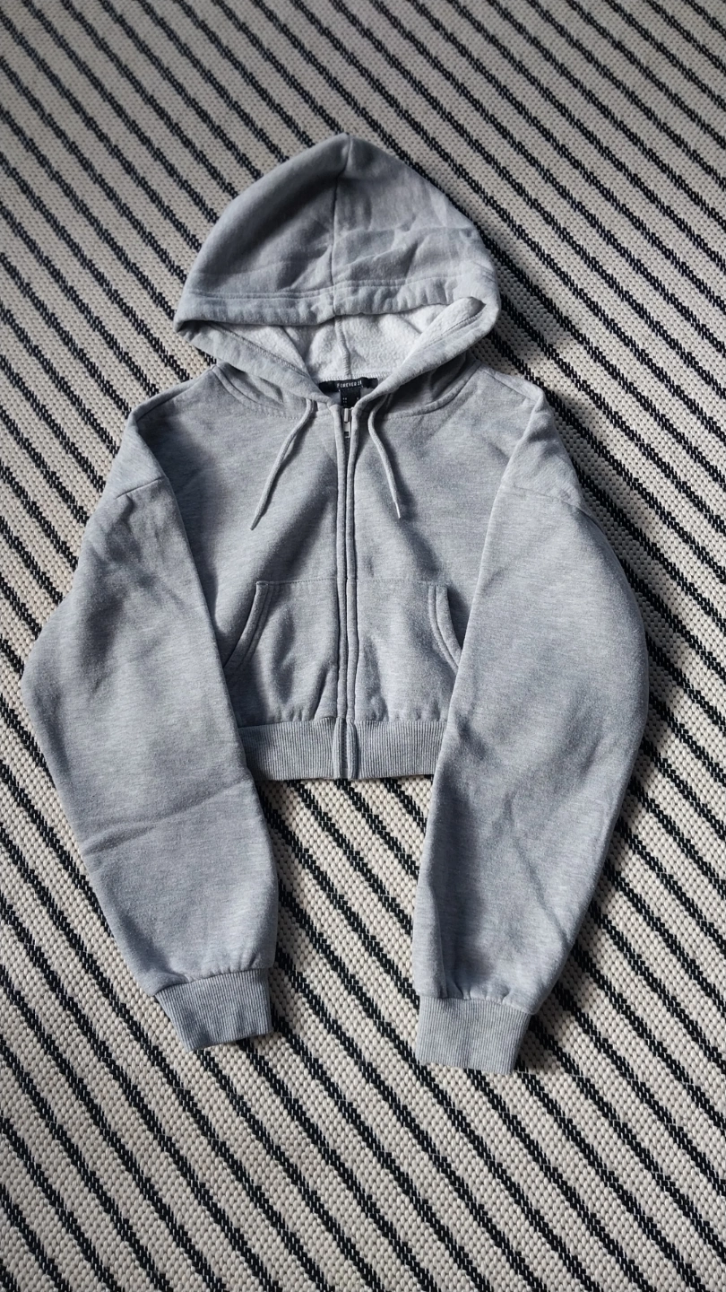 A grey cropped hoodie. Has a hood with a drawstring. Ribbed cuffs and hem. Full zip closure. Front pockets. You can wrap yourself in this and feel your stress melt away.