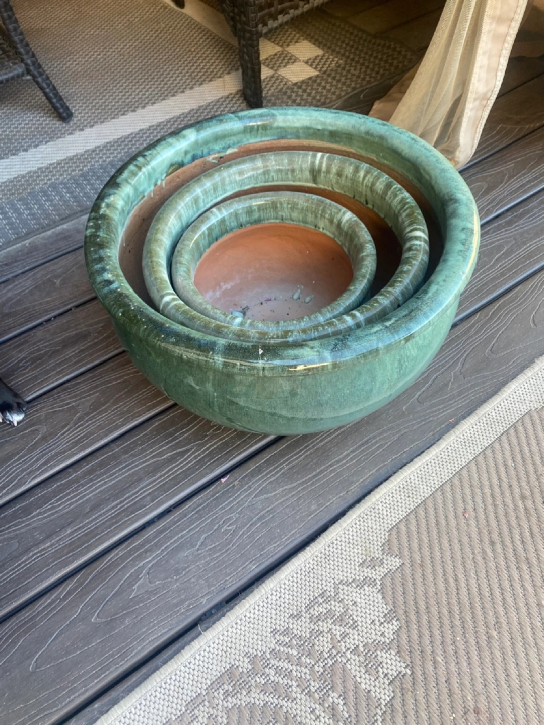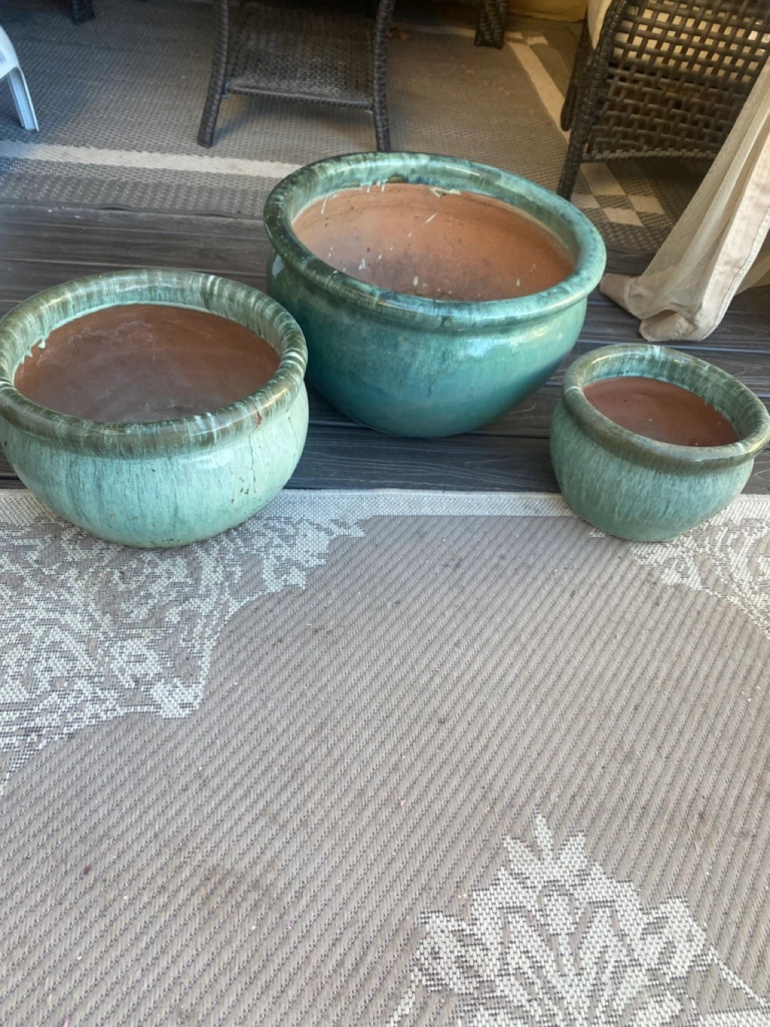 Planter set features three planters in varying sizes. Green glazed finish. The planters would be perfect for creating a serene outdoor space.