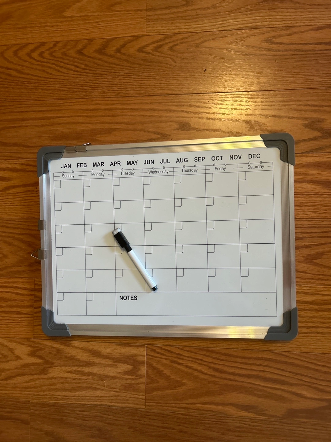 White monthly calendar, perfect for jotting down notes. Consider using this board to organize your day, it may help you find peace in the chaos.