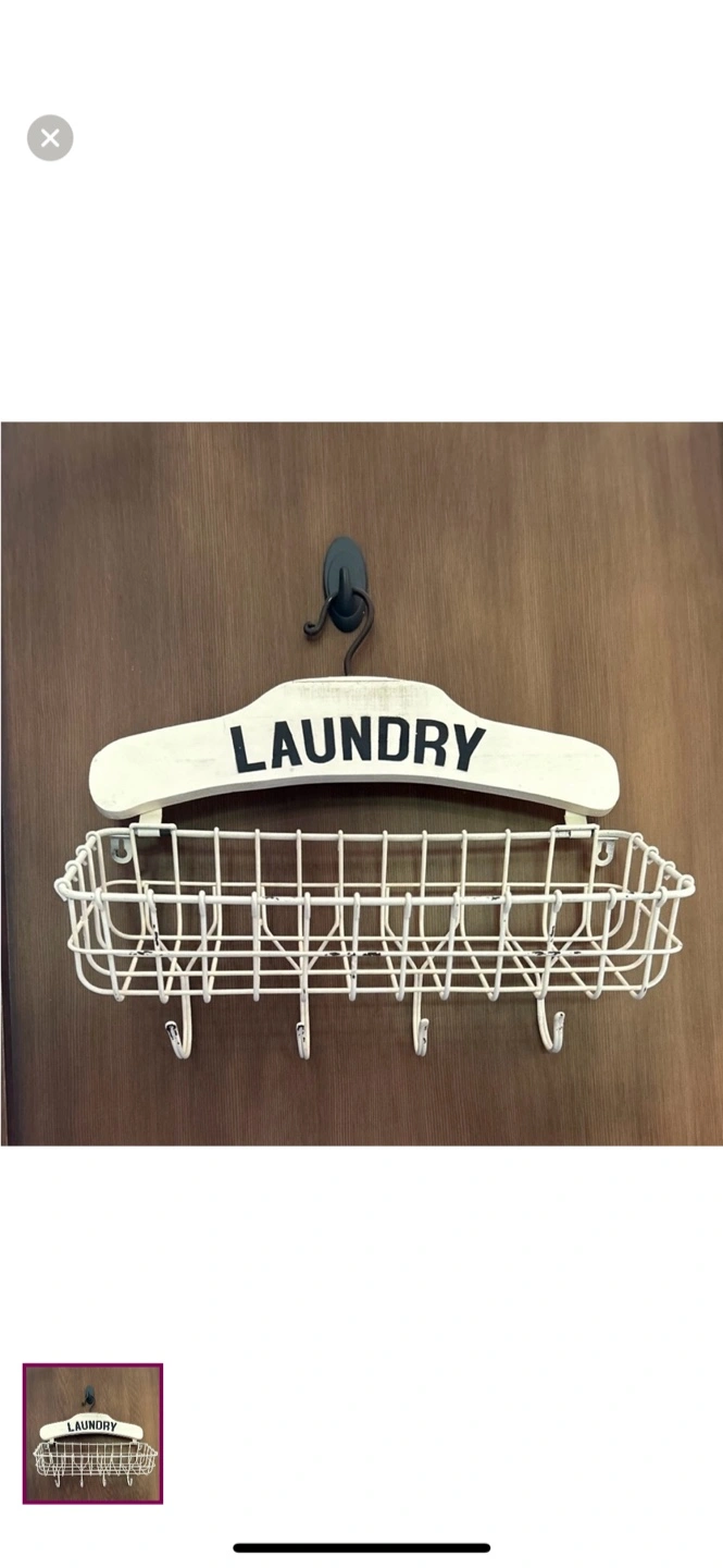 Features a white metal basket and a hanger shaped backboard. Includes hooks for hanging items. This item would be a great addition to any laundry room to keep it organized.
