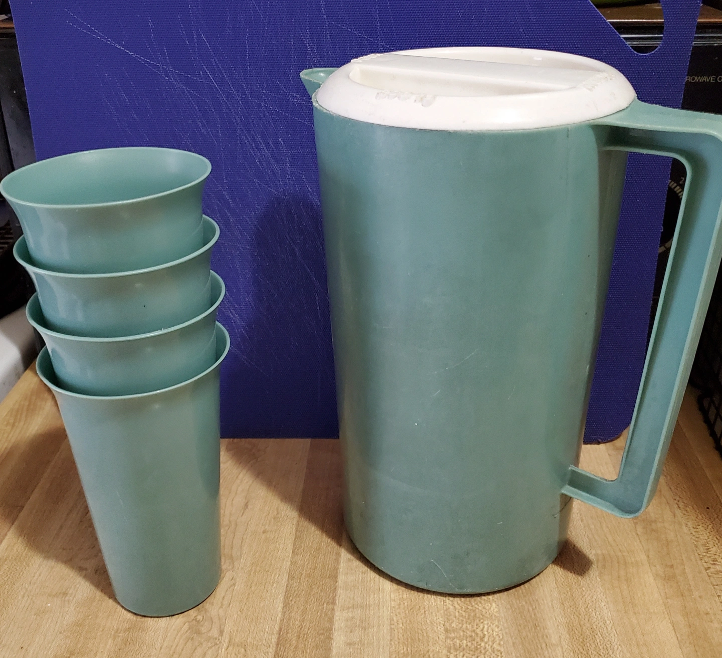 243Plastic turquoise pitcher with tight sealing lid holds 2 quarts. Four matching cups included. Great for picnics in the park!