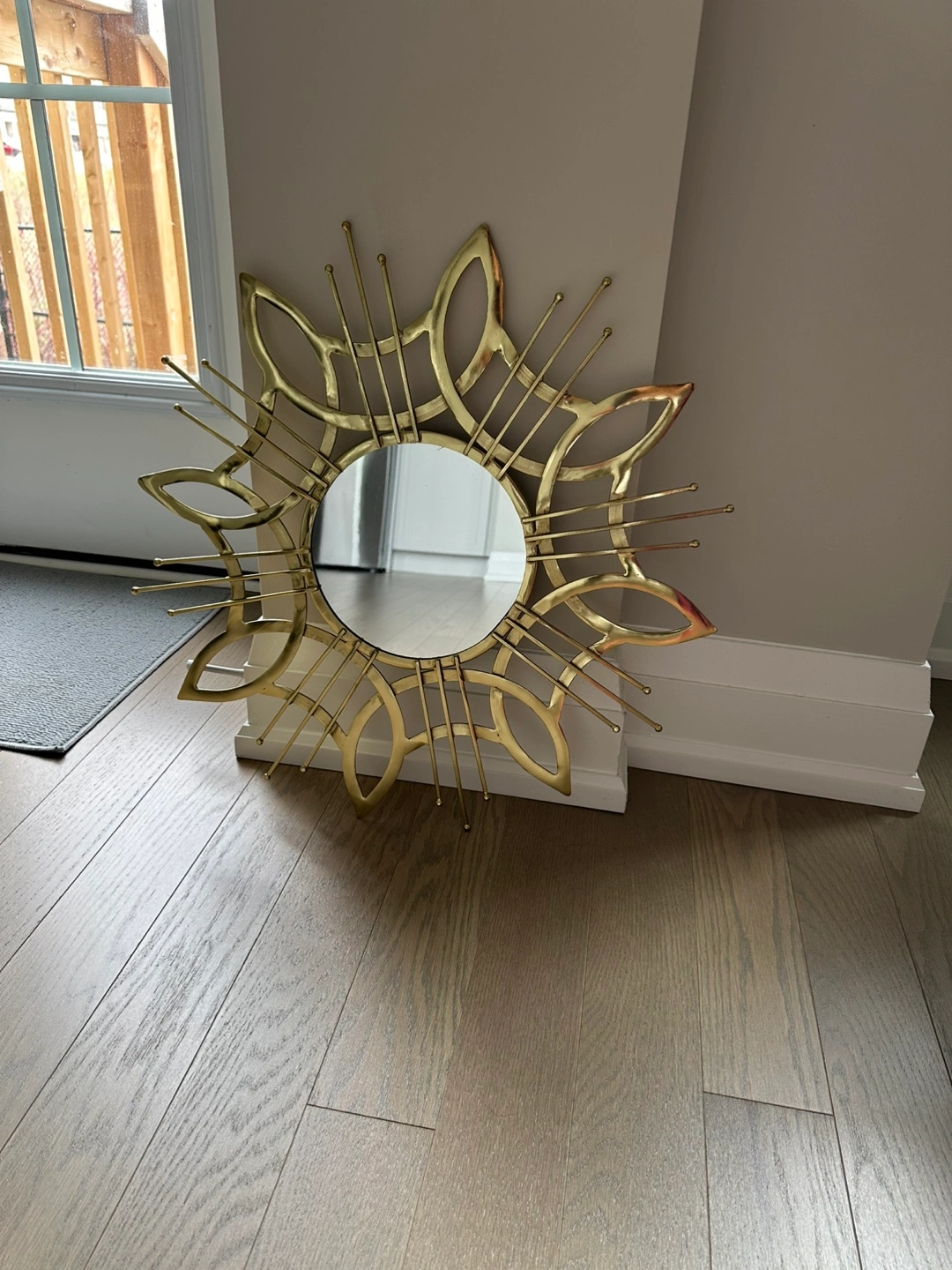 Sunburst mirror in a gold finish. Features a circular mirror in the center. Decorative design with an openwork frame. Hang this beautiful mirror to add light to a cozy space.
