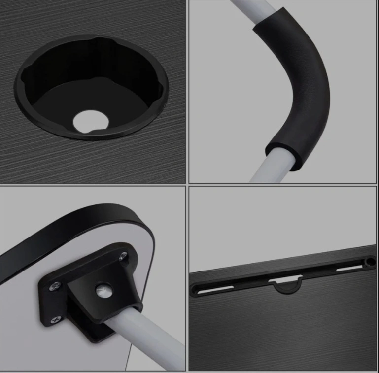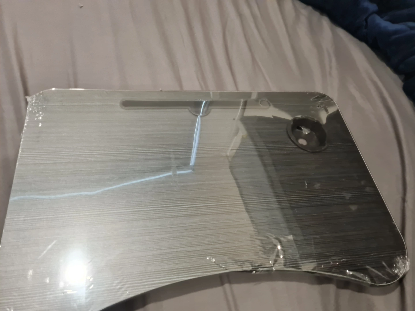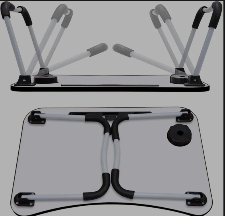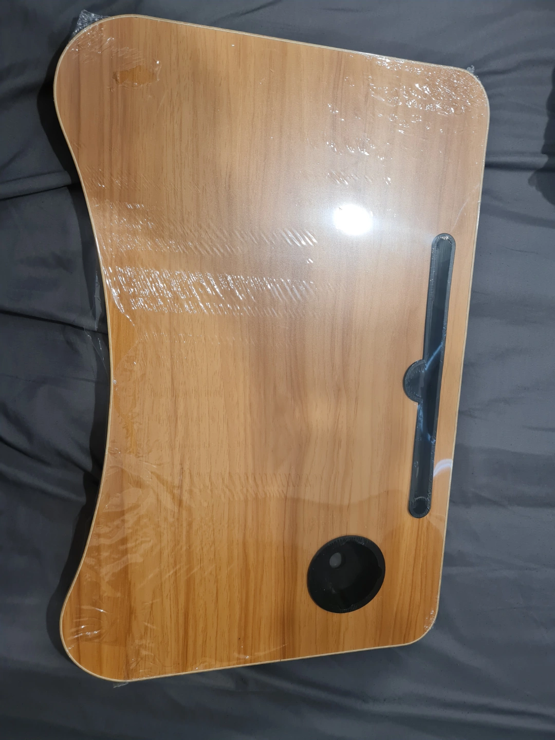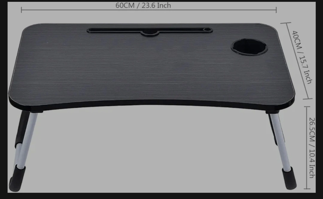 A foldable laptop desk with legs. Comes with a cup holder and a tablet slot. Made of a wooden surface. Perfect for use in bed or on the couch. You may enjoy a moment of peace while getting work done.