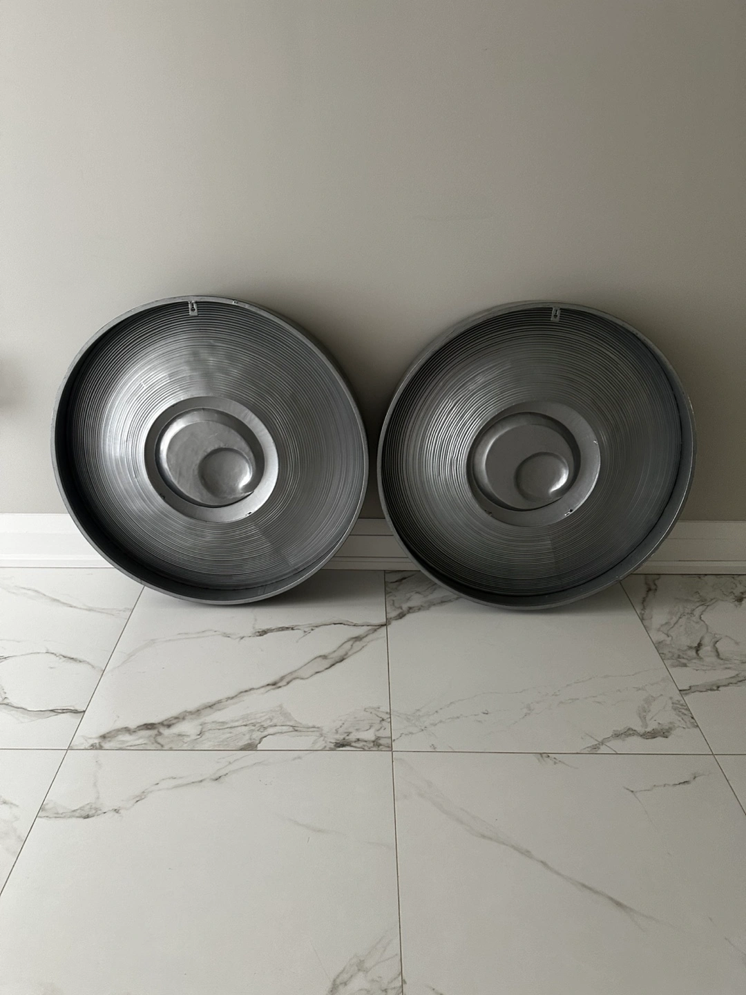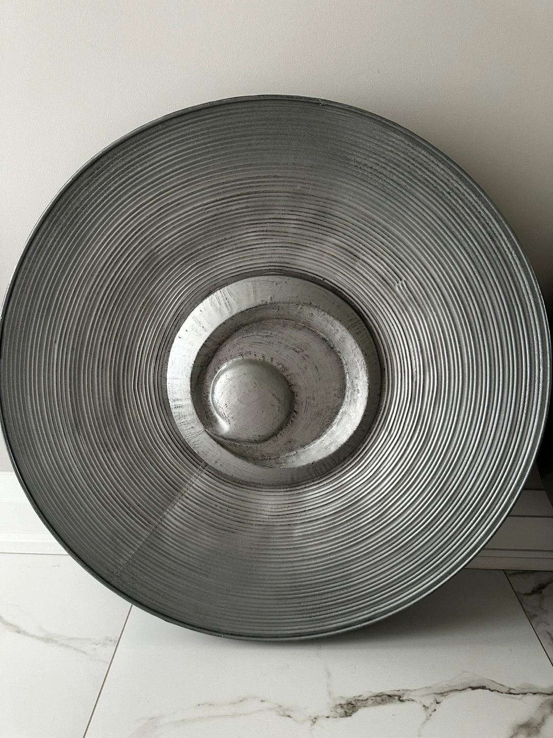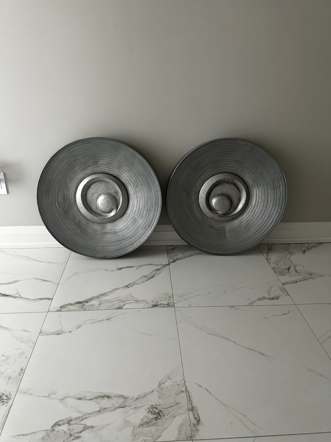 Two circular metal wall art pieces. Featuring concentric circles. A great addition to any home for a calming atmosphere.