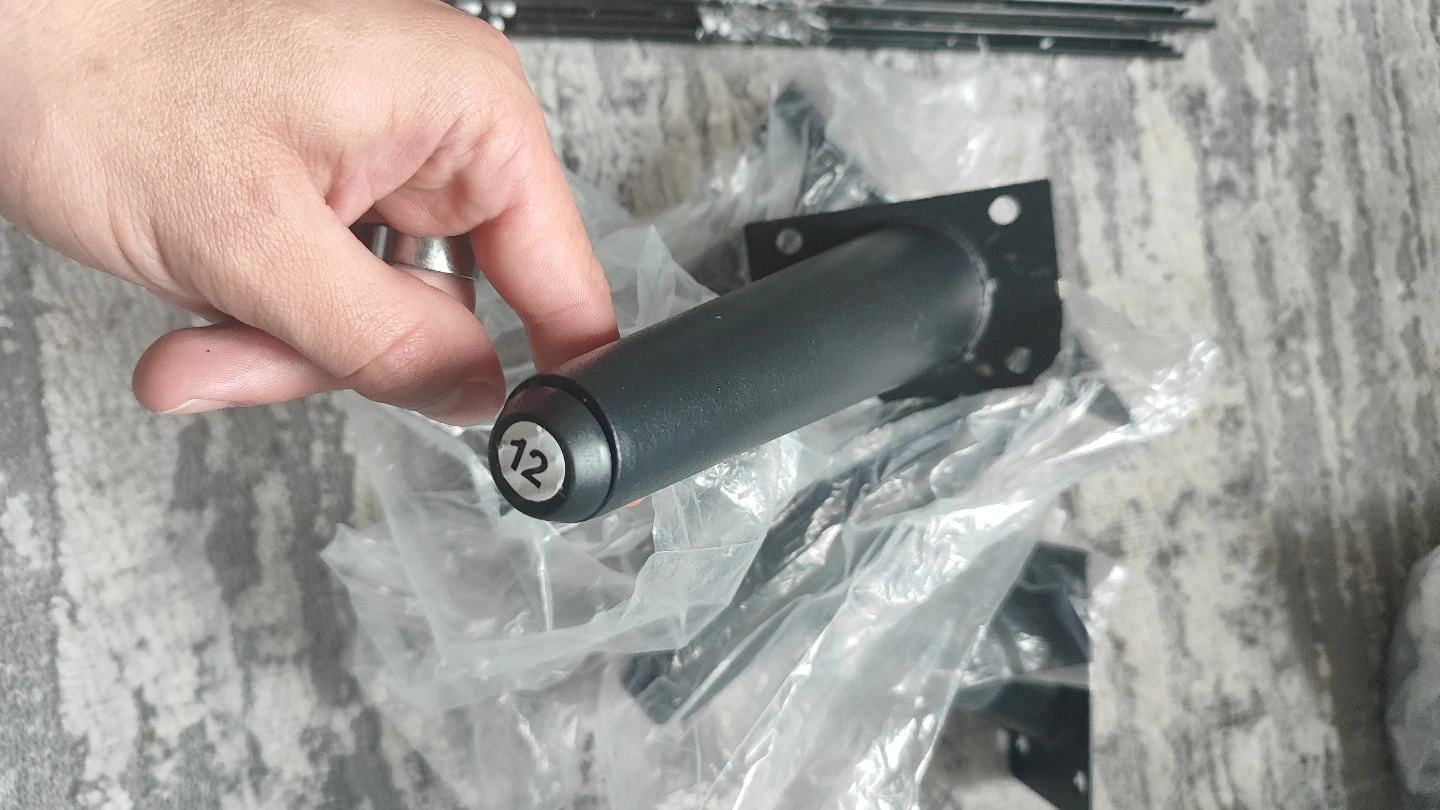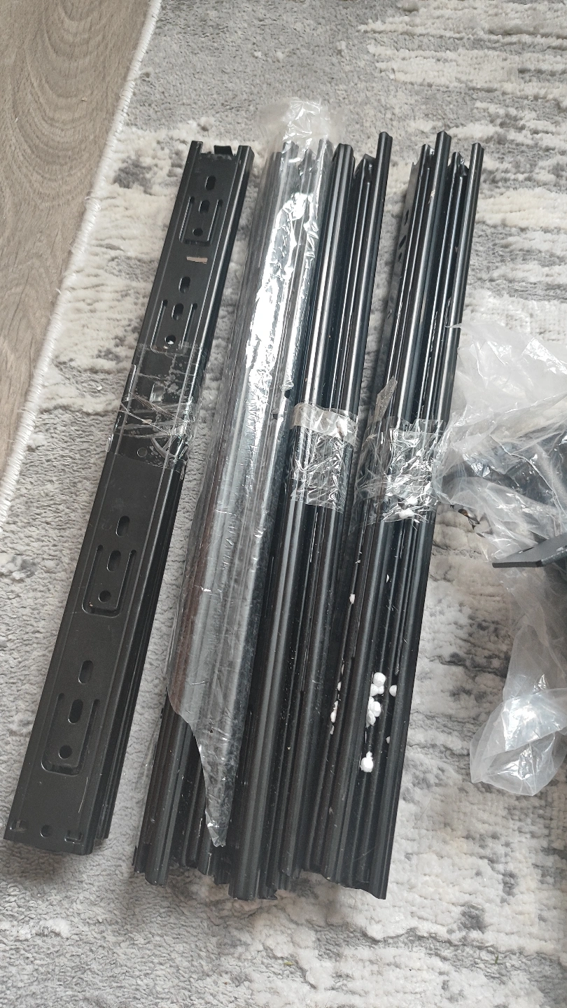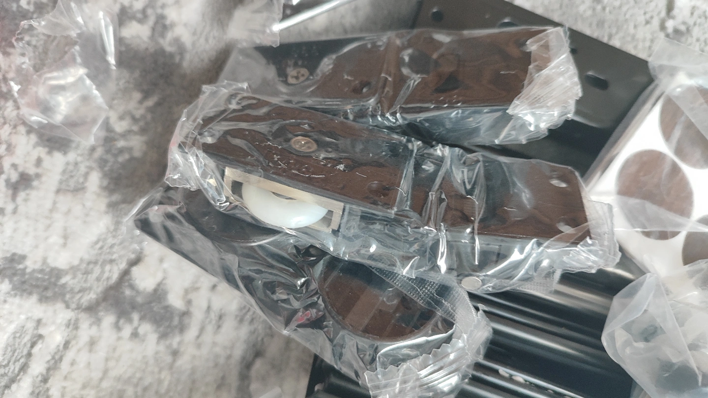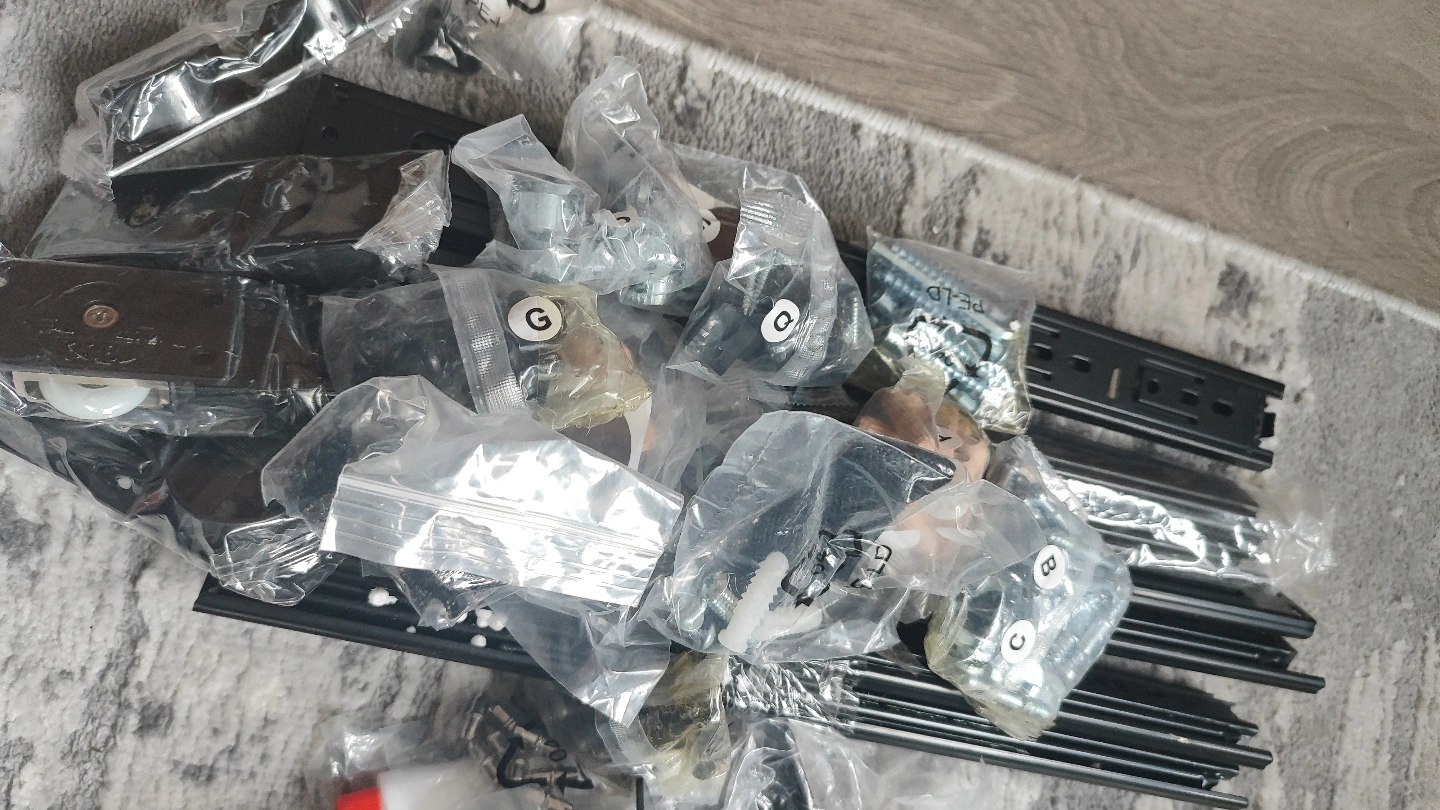 A collection of furniture components. Some black metallic poles. Rails and various hardware parts in plastic packaging. Perfect for a DIY project to bring your furniture vision to life, one piece at a time.