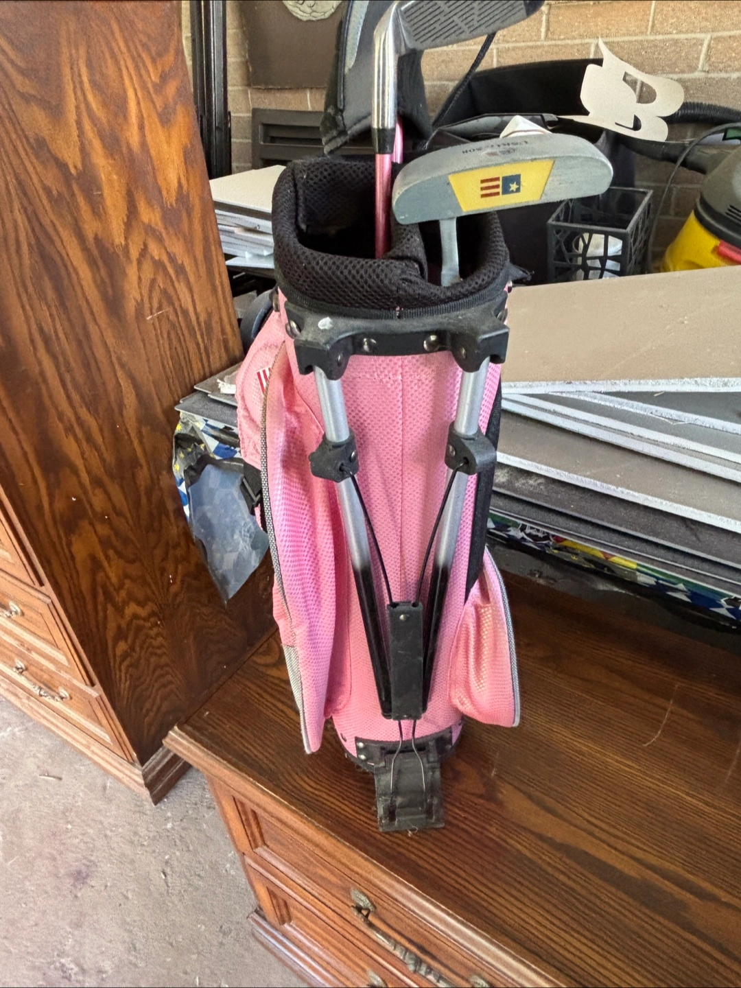 A pink golf club set with clubs in the bag. Comes with a cover for the driver. This set will bring joy to its next owner.