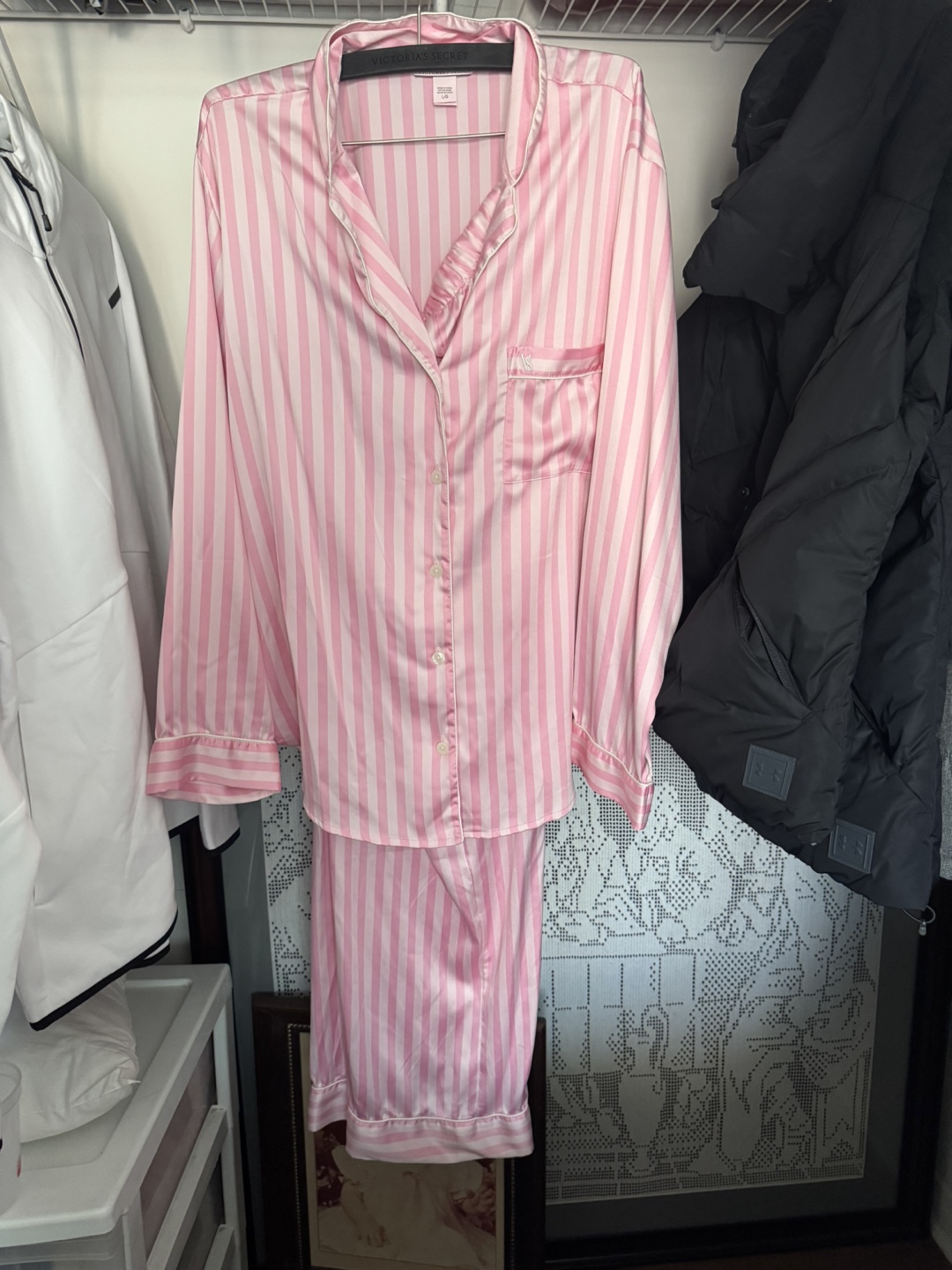 Pink and white striped pajama set. Button-down shirt, with a breast pocket and long pants. Great for lounging around at home.