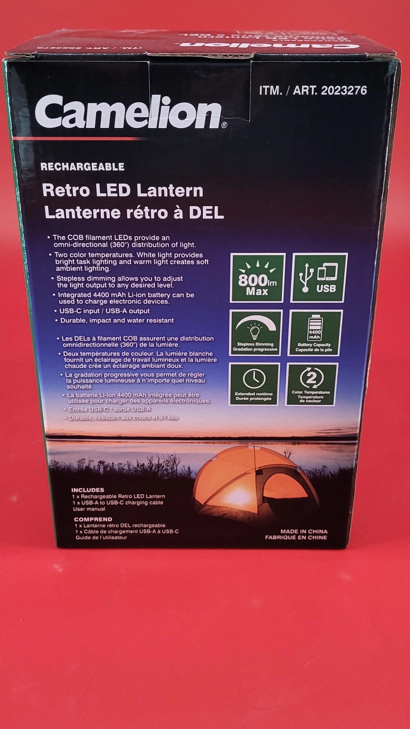 Lantern with a retro design. Features multiple light settings and USB charging capabilities. A great option for creating a warm and inviting atmosphere during your outdoor adventures.
