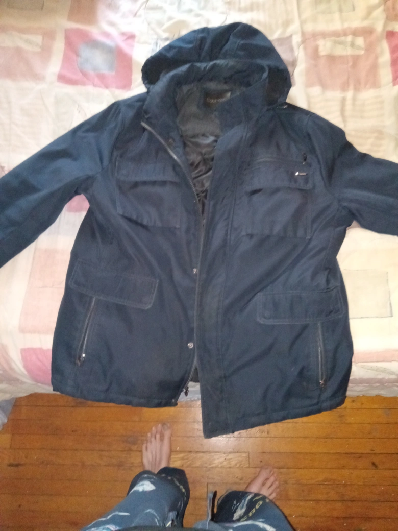 Dark navy blue men's jacket. Features a hood, zipper closure, and multiple pockets. Durable, water-resistant outer shell. Great for layering.