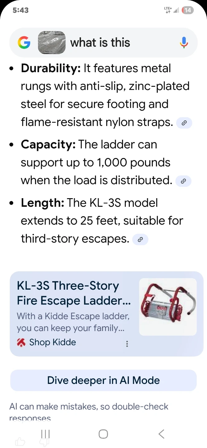 This is a Kidde KL-3S three-story fire escape ladder. It's designed for emergency use from third-story rooms. The ladder extends to 25 feet with metal rungs and flame-resistant nylon straps, supporting up to 1000 pounds.