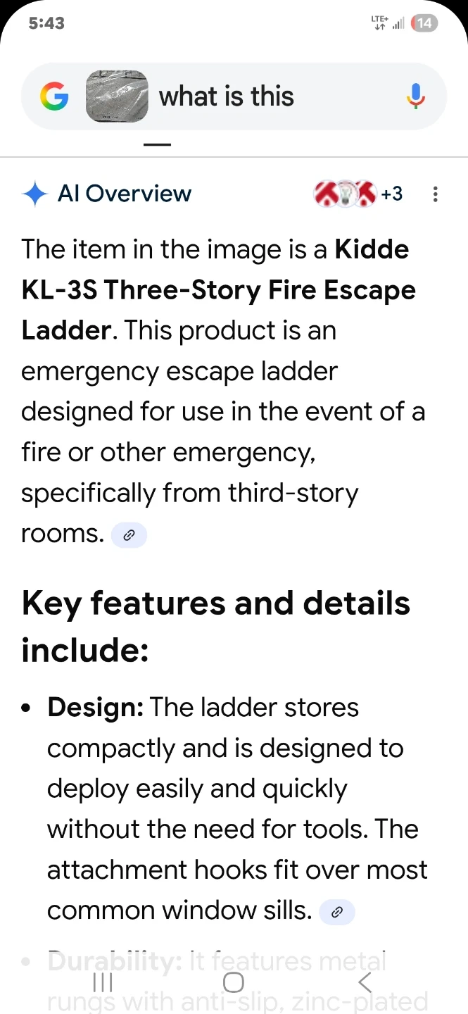 This is a Kidde KL-3S three-story fire escape ladder. It's designed for emergency use from third-story rooms. The ladder extends to 25 feet with metal rungs and flame-resistant nylon straps, supporting up to 1000 pounds.