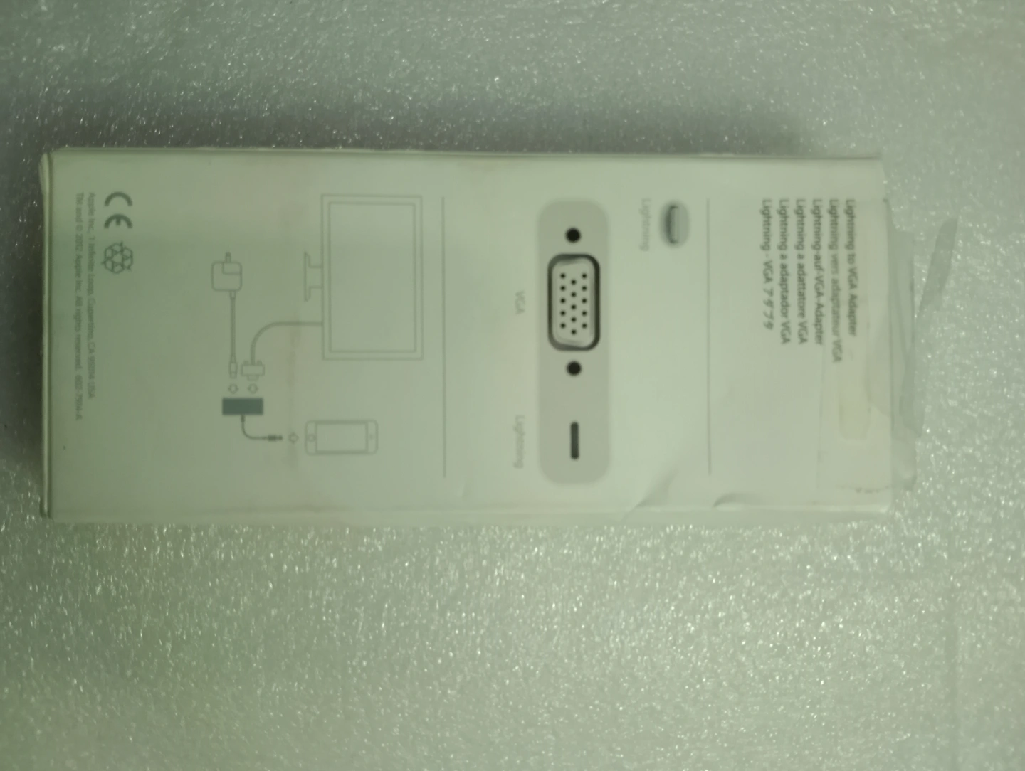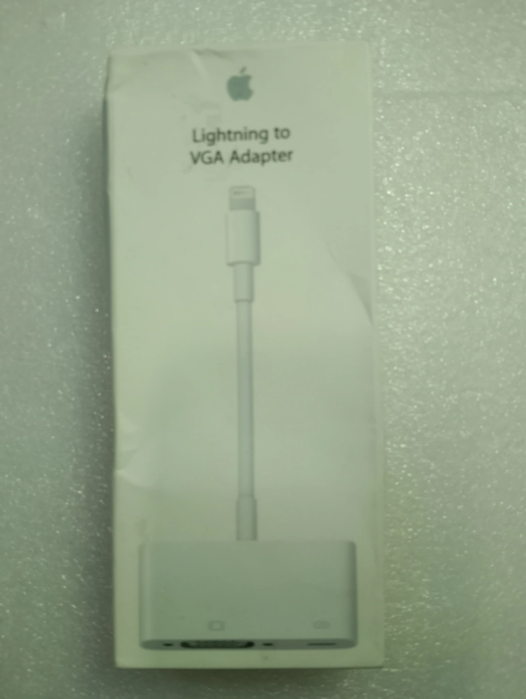 Adapter is new in its packaging. It is white. The adapter is designed for use with Apple products. Connect your device for display on a projector in a quiet setting.