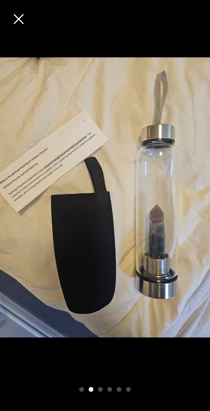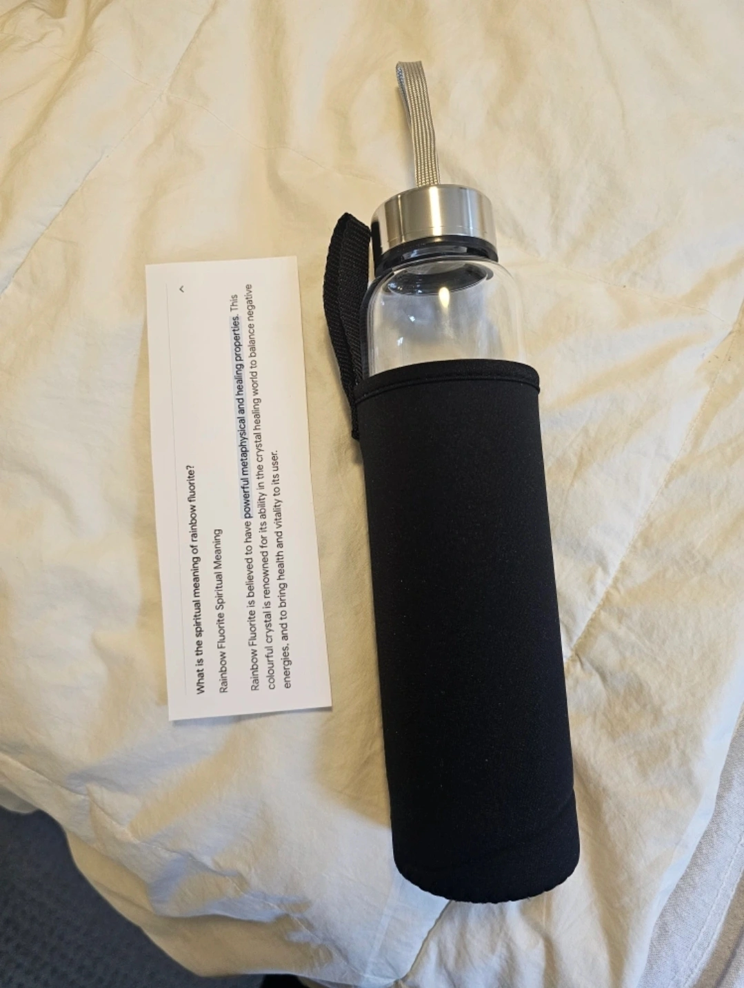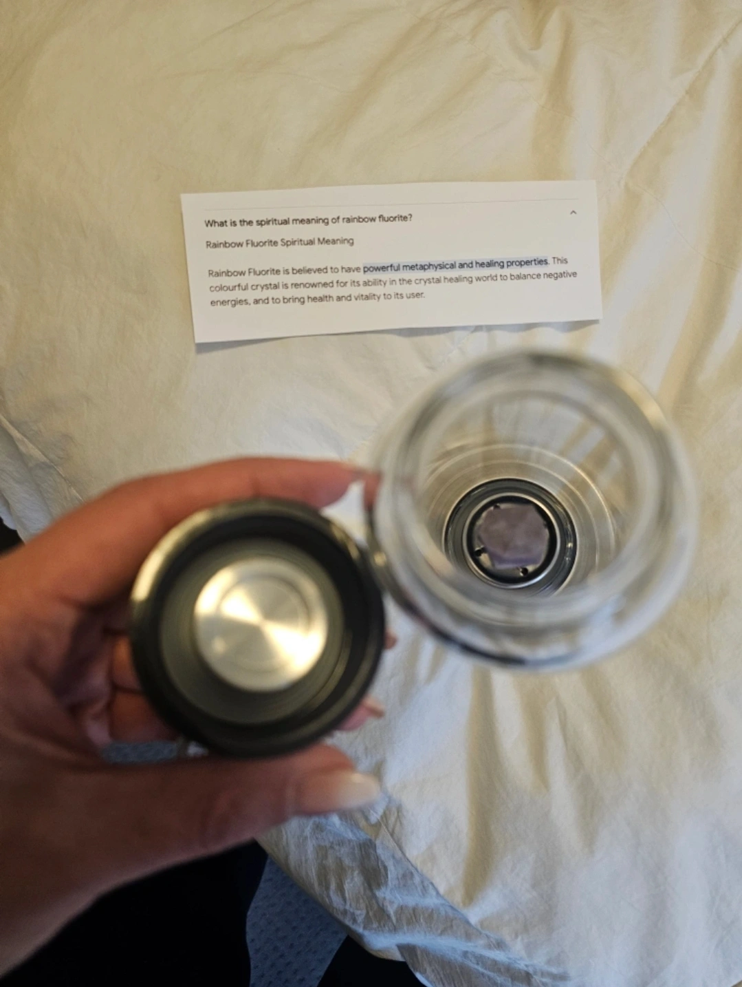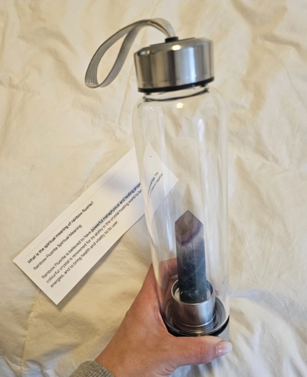 Glass water bottle with Rainbow Flourite crystal to infuse water with healing properties.
