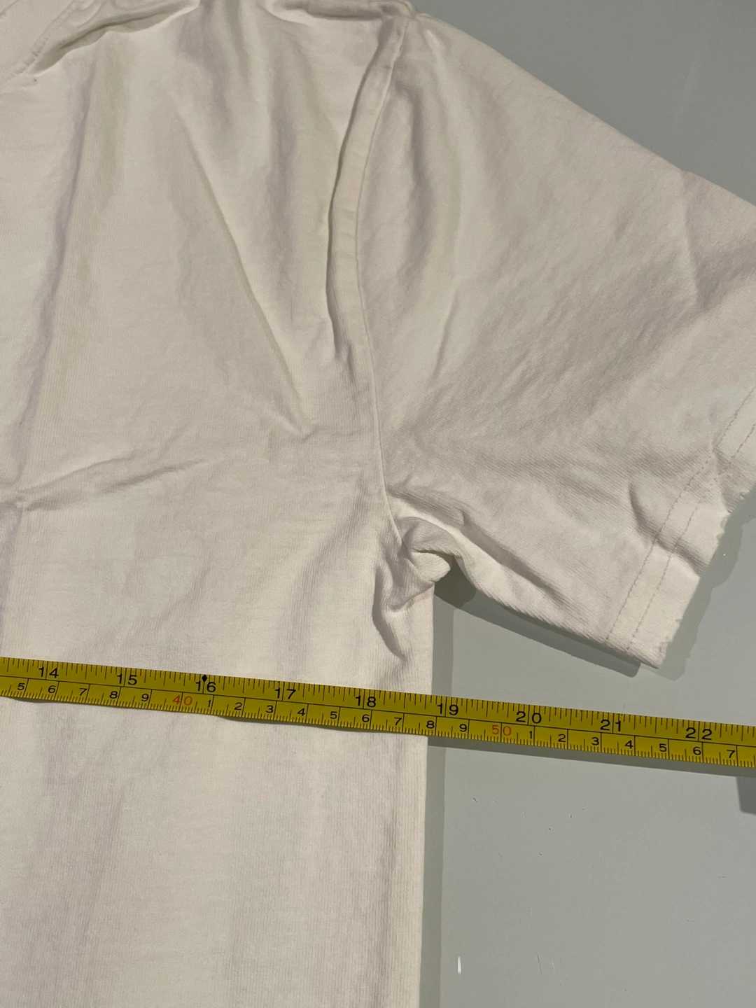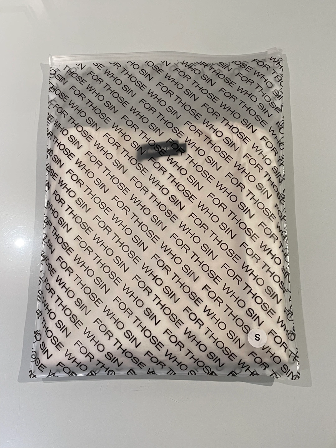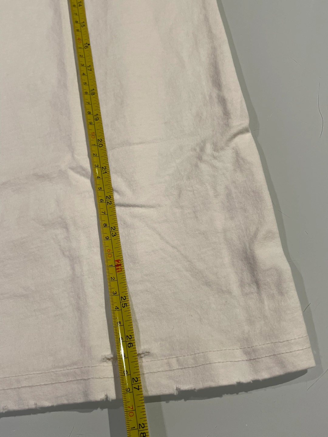 Distressed detailing along the collar and hem. Comes in original plastic bag with branding.