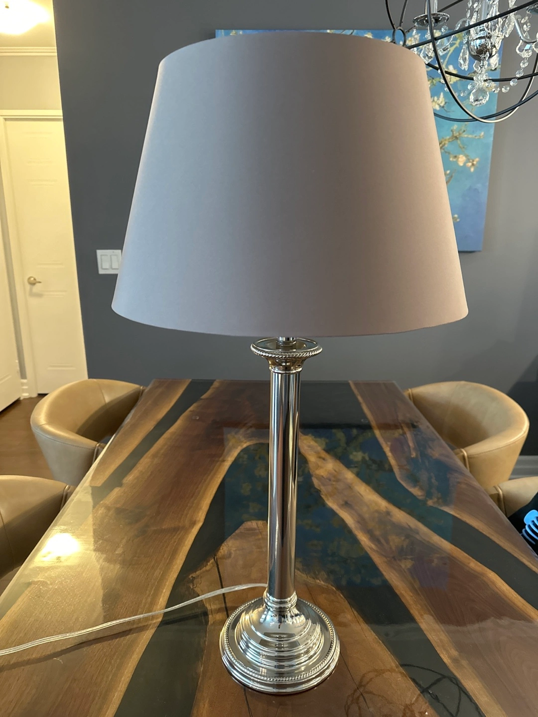 Features a silver base. Lamp shade is grey. Perfect for adding a gentle light source to a room for reading or relaxing.