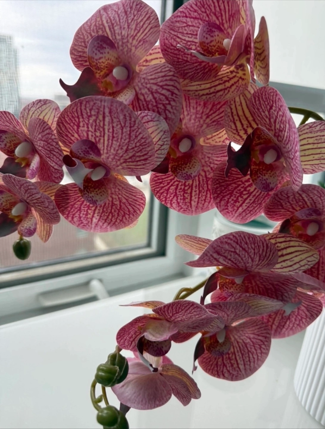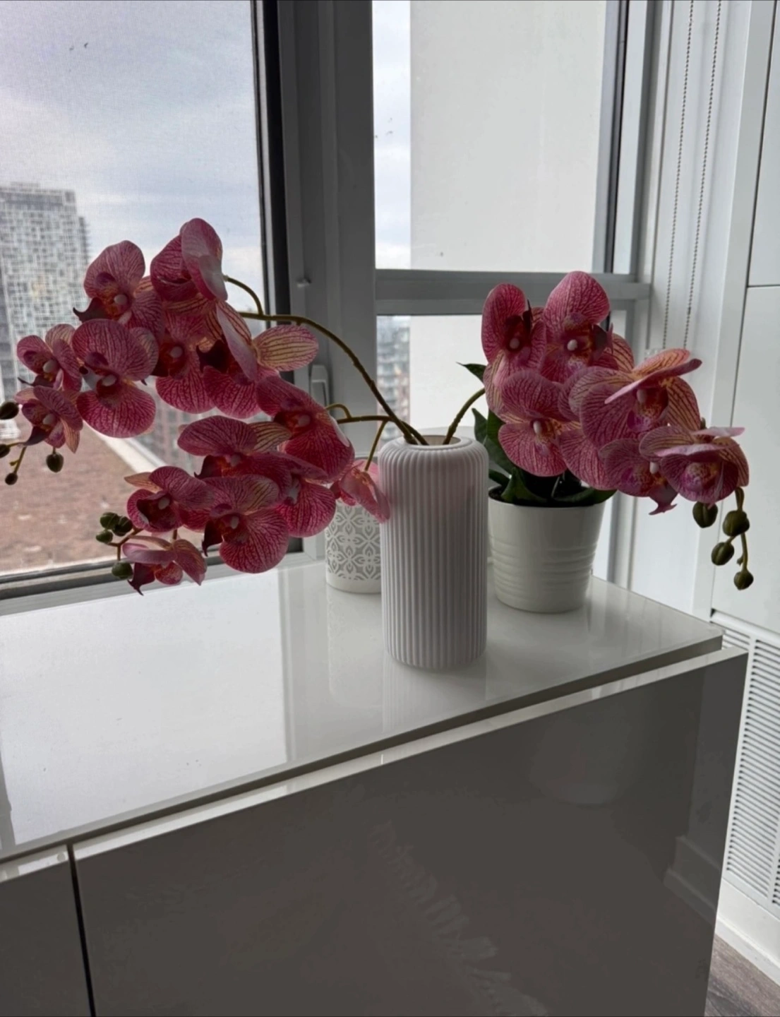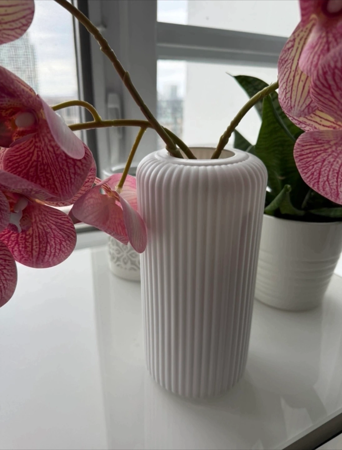 1000+A white vase. Features vertical ribbing. Great for displaying flowers on a shelf.
