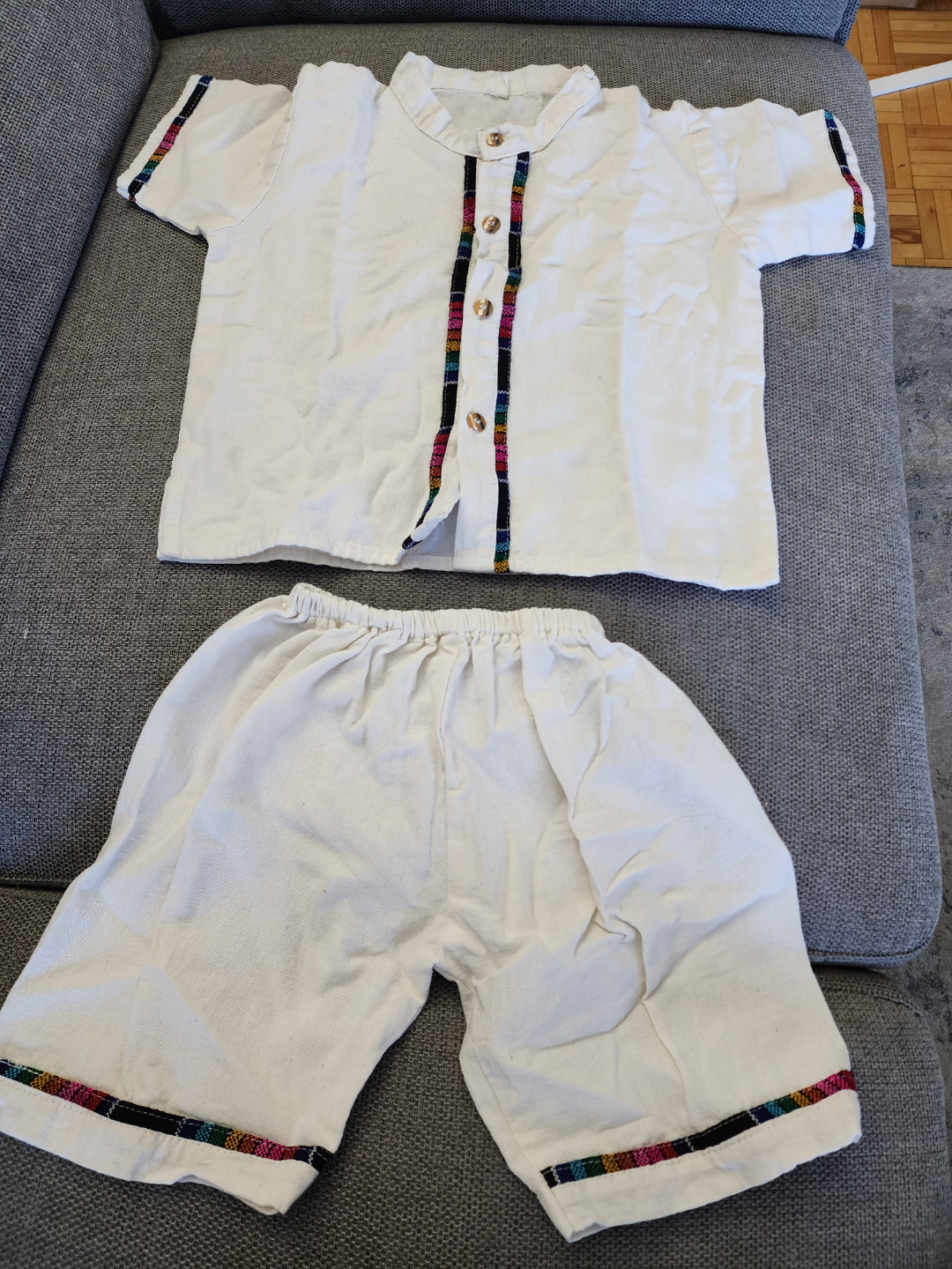 White top and shorts set. Colorful trim along the shirt and shorts. Button-up shirt. Matching shorts with elastic waistband. A perfect outfit for a day of play.