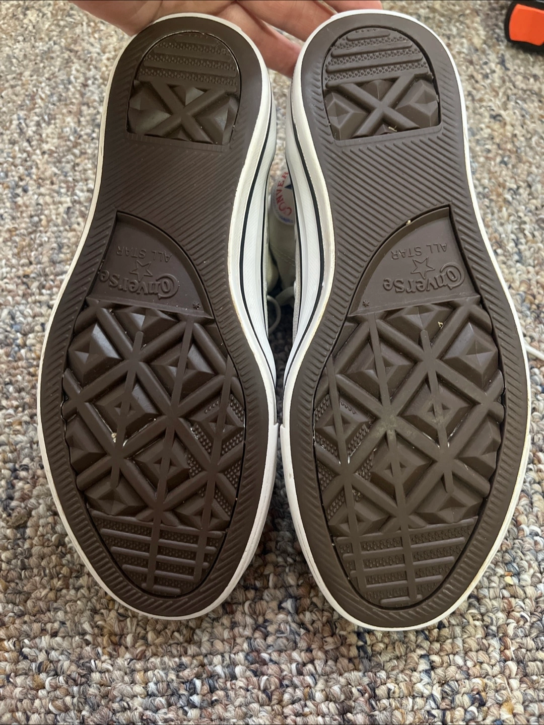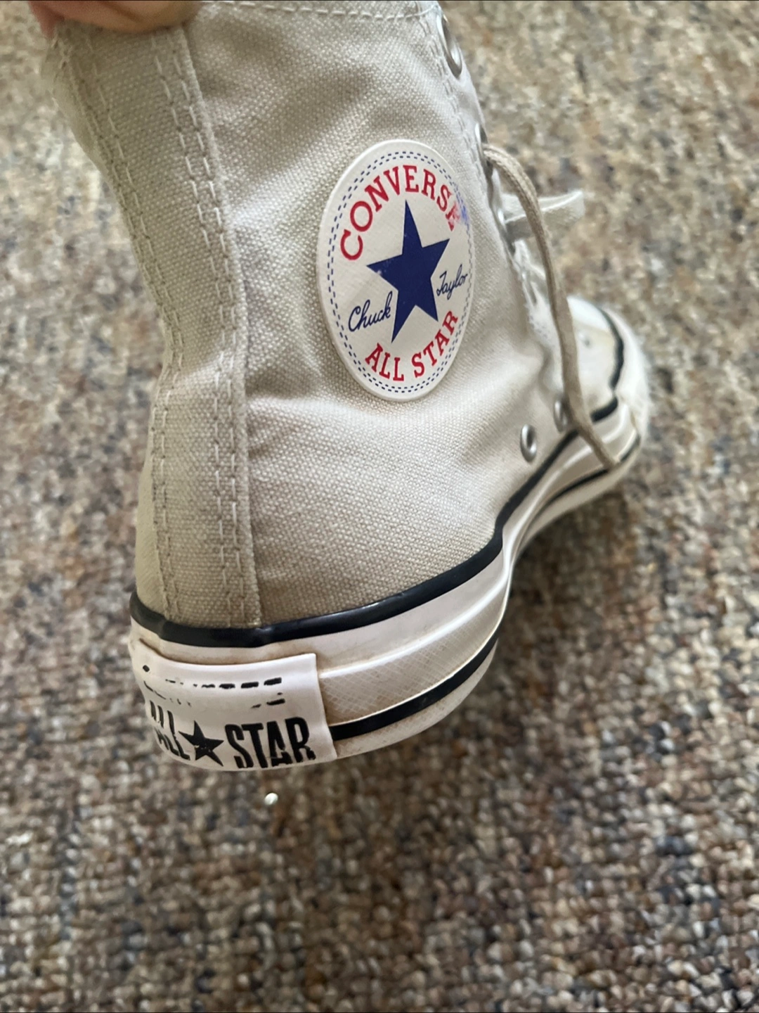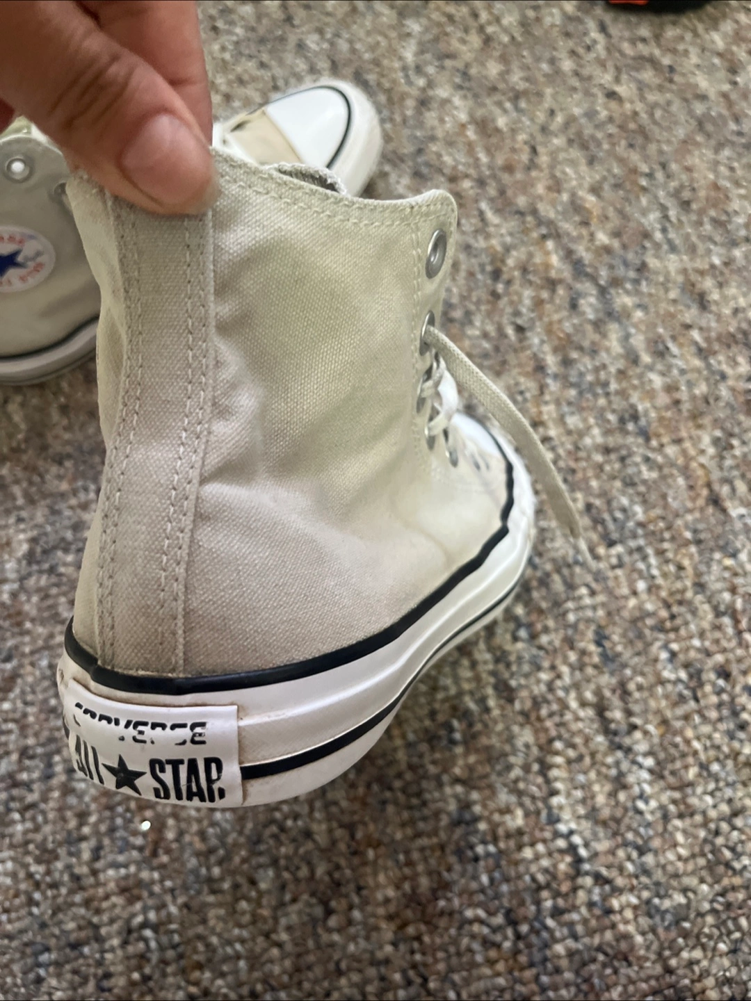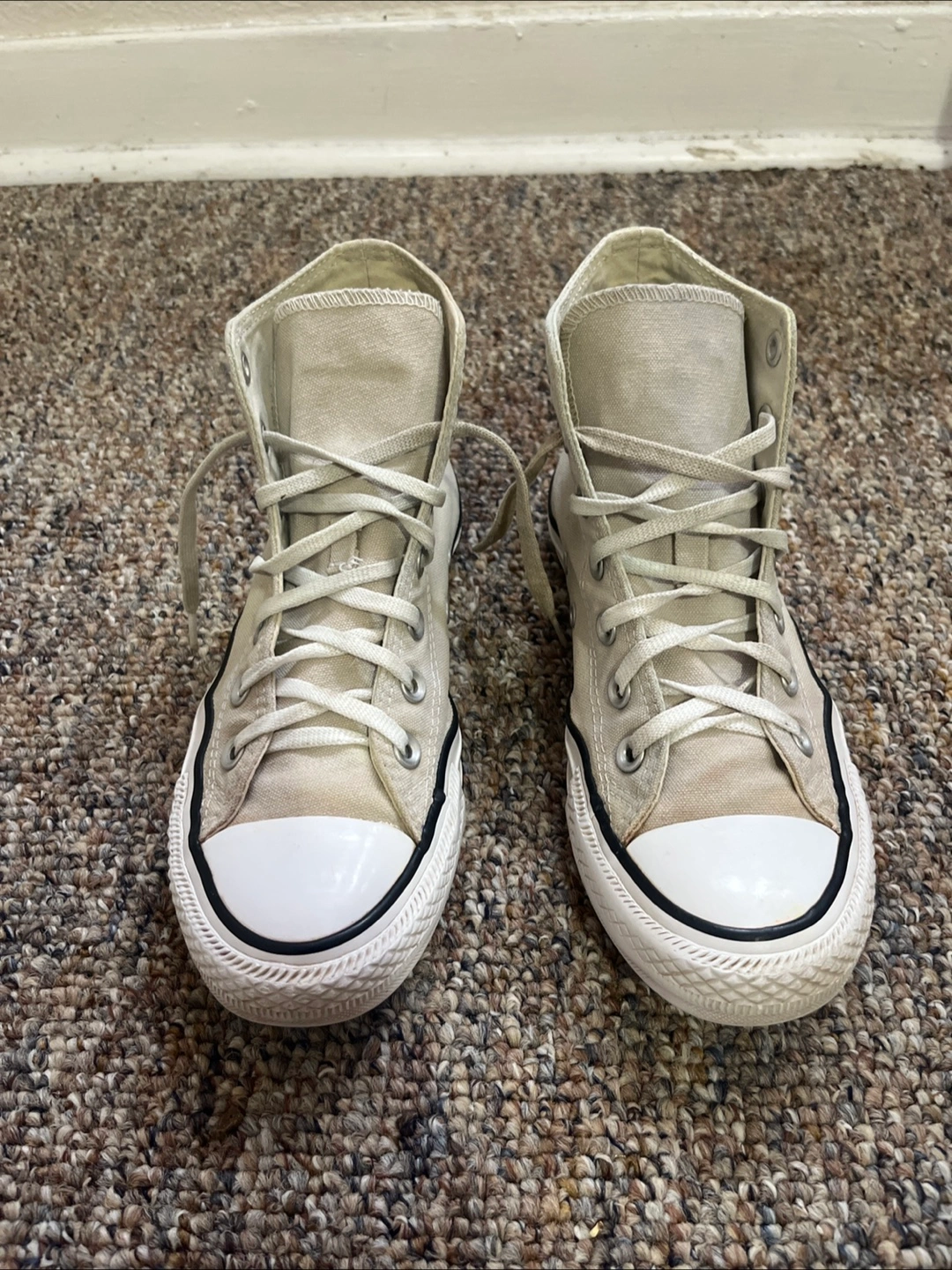 Pair of high-top sneakers. White laces and white toe cap. Canvas material in a neutral color. Great for completing an outfit or just to have on hand for a chill day.