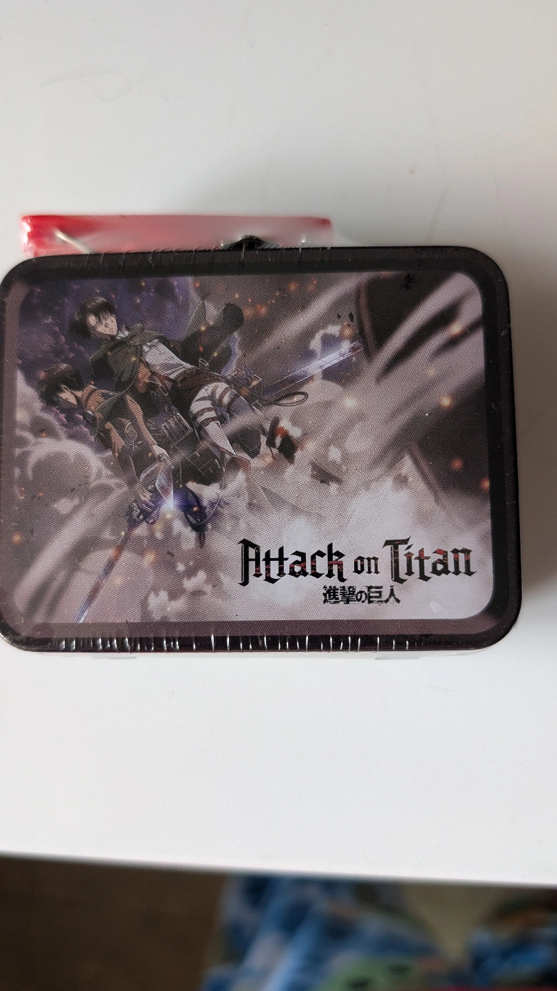 Rectangular tin. Features artwork of characters from Attack on Titan. Can be used to store small treasures, helping you find a moment of peace.
