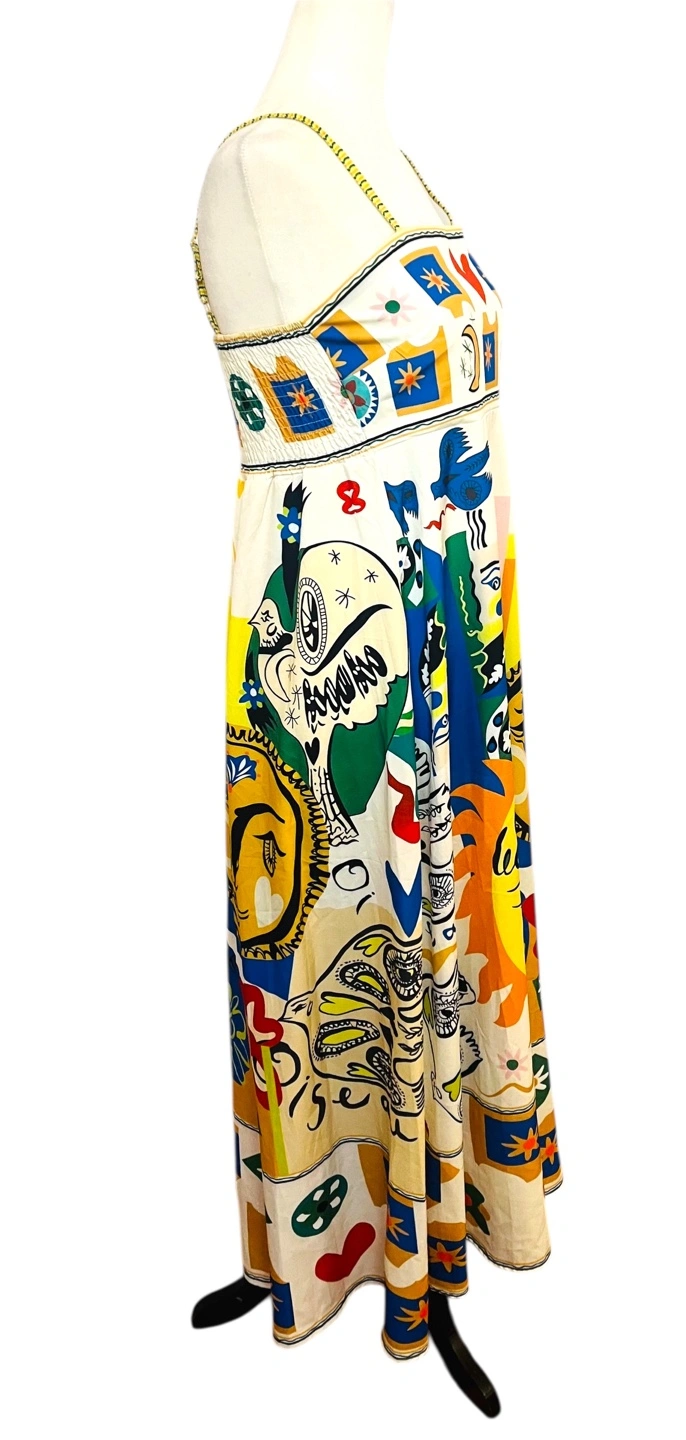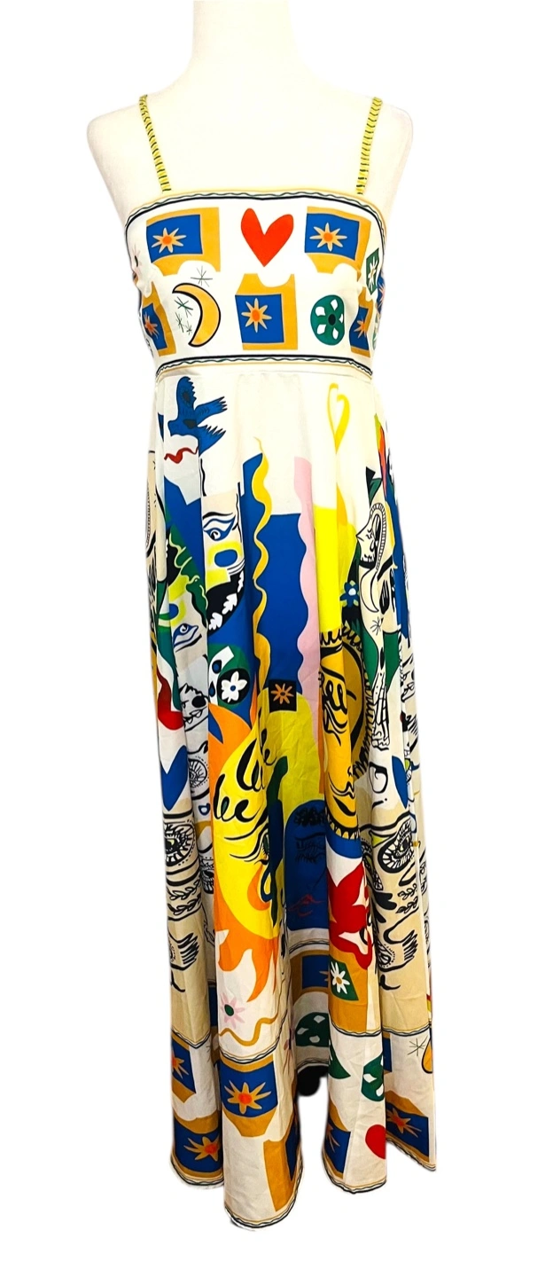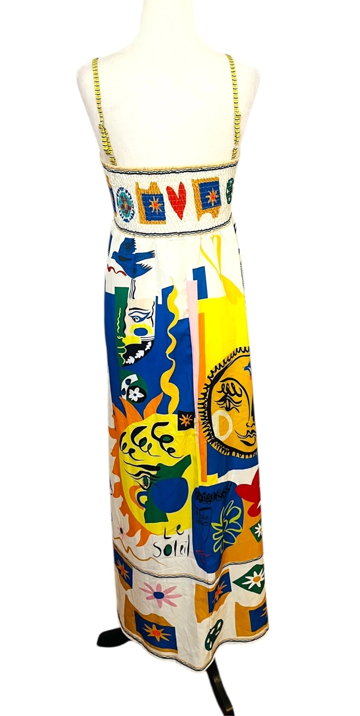 Unleash your inner artist with this vibrant maxi dress, a wearable masterpiece that captures the eye and sparks conversation. The dress features a playful, abstract print with sun, moon, and star motifs in a kaleidoscope of colors. The sleeveless design and flowing silhouette create an effortlessly chic look, perfect for warm days and balmy evenings. The eye-catching print ensures you'll stand out from the crowd, while the comfortable fit allows you to move with ease. This dress is ideal for a summer garden party, a beachside brunch, or an art gallery opening. Style: Maxi, Sundress, Slip Dress Dress Length: Long Color: Multicolor Department: Women Sleeve Length: Sleeveless Pattern: Abstract Occasion: Casual, Party/Cocktail, Travel Material: Polyester, 100% Polyester Neckline: Square Neck Fabric Type: Woven Character: Sun, Moon, Star Season: Summer, Spring Like New PU Ottawa & Strasburg, Kitchener Keywords: maxi dress, abstract print, sleeveless dress, summer dress, bohemian dress, colorful dress, sun print, moon print, star print, casual dress, boho chic, festival dress, size small, women's fashion