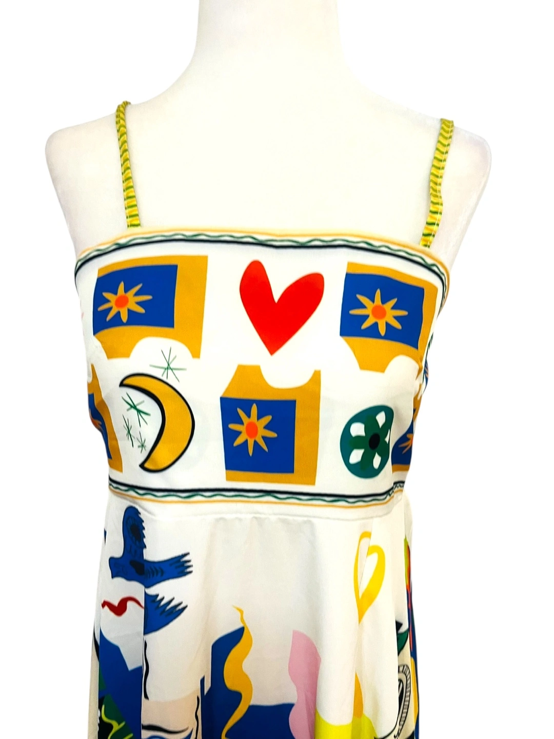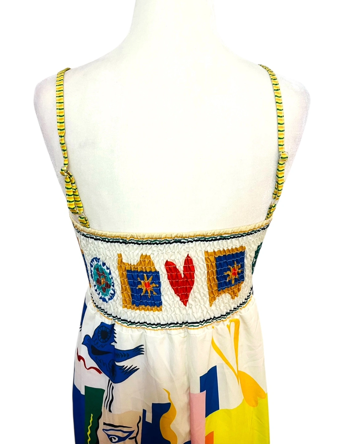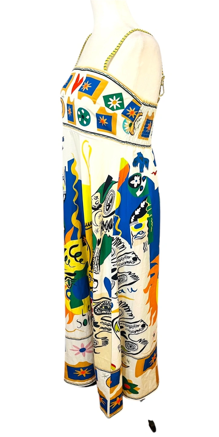 Unleash your inner artist with this vibrant maxi dress, a wearable masterpiece that captures the eye and sparks conversation. The dress features a playful, abstract print with sun, moon, and star motifs in a kaleidoscope of colors. The sleeveless design and flowing silhouette create an effortlessly chic look, perfect for warm days and balmy evenings. The eye-catching print ensures you'll stand out from the crowd, while the comfortable fit allows you to move with ease. This dress is ideal for a summer garden party, a beachside brunch, or an art gallery opening. Style: Maxi, Sundress, Slip Dress Dress Length: Long Color: Multicolor Department: Women Sleeve Length: Sleeveless Pattern: Abstract Occasion: Casual, Party/Cocktail, Travel Material: Polyester, 100% Polyester Neckline: Square Neck Fabric Type: Woven Character: Sun, Moon, Star Season: Summer, Spring Like New PU Ottawa & Strasburg, Kitchener Keywords: maxi dress, abstract print, sleeveless dress, summer dress, bohemian dress, colorful dress, sun print, moon print, star print, casual dress, boho chic, festival dress, size small, women's fashion