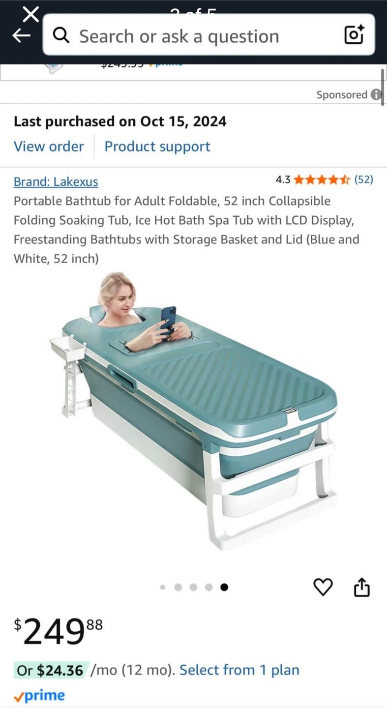 52 inch portable tub, perfect for adults and children! Could be used for ice baths or great for kids and relaxation when you don’t have a tub. Comes with a cover, storage basket, and head rest. Has two drains for quick draining, and collapses for easy storage. (Temperature gage does not work)