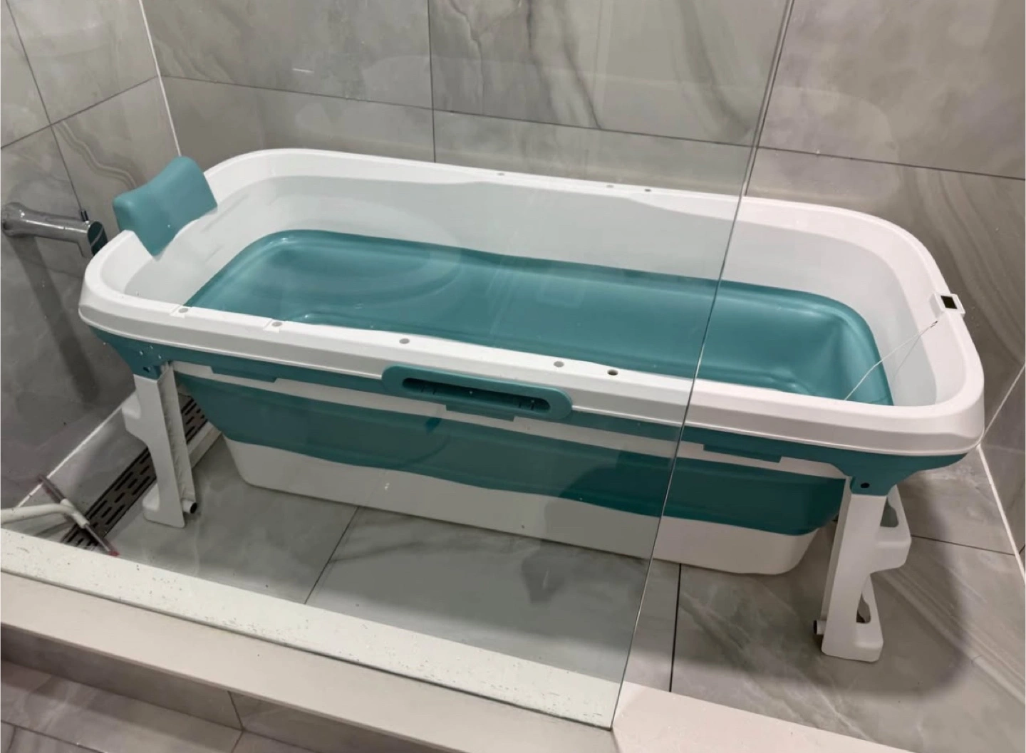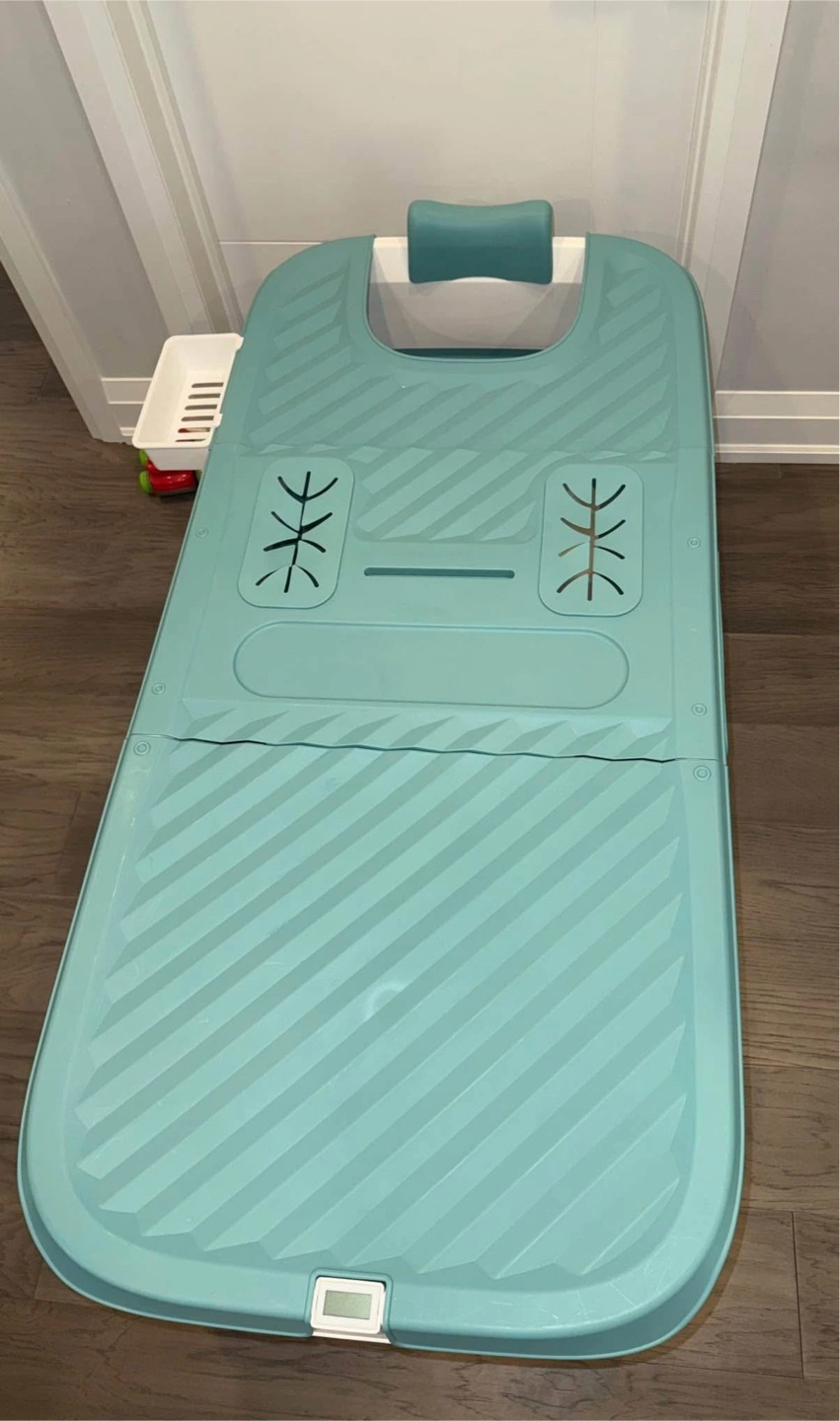 52 inch portable tub, perfect for adults and children! Could be used for ice baths or great for kids and relaxation when you don’t have a tub. Comes with a cover, storage basket, and head rest. Has two drains for quick draining, and collapses for easy storage. (Temperature gage does not work)