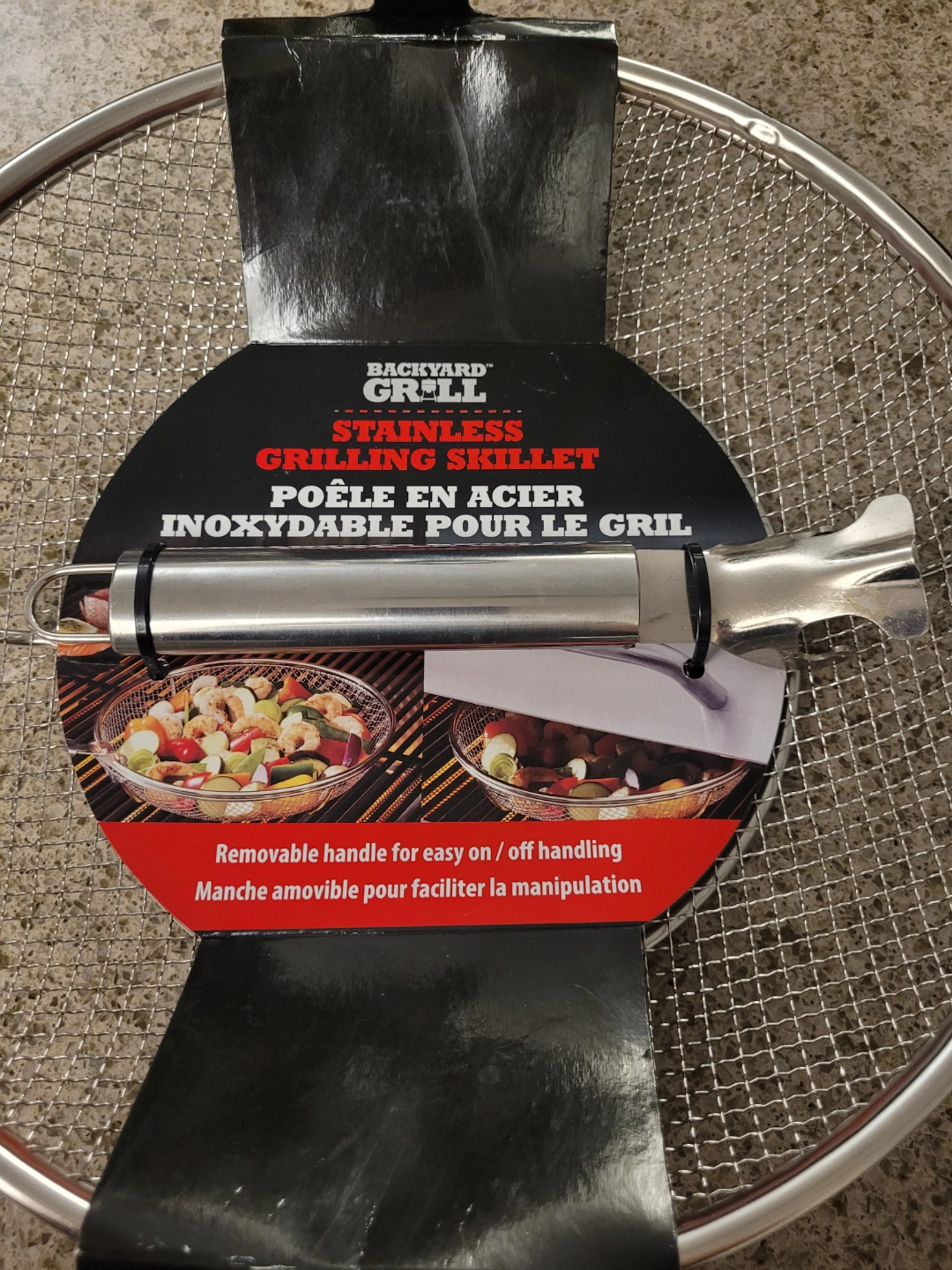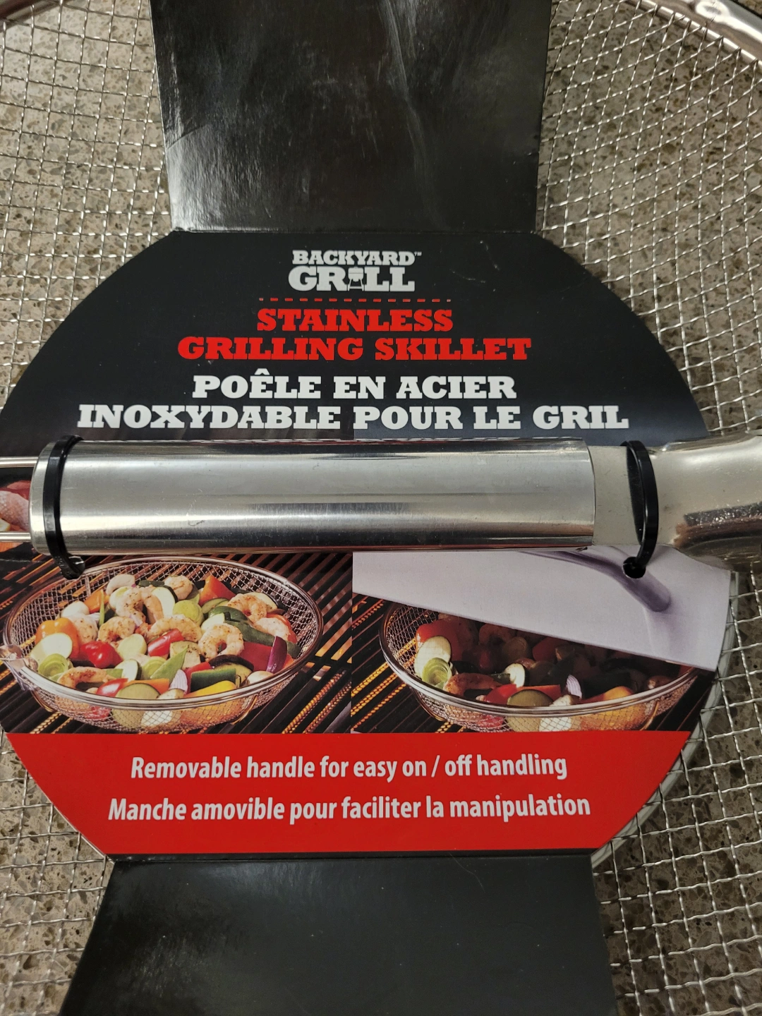 Stainless steel grilling skillet. Includes removable handle. Perfect for cooking your favourite veggies on the grill, and enjoy your calming BBQ experience