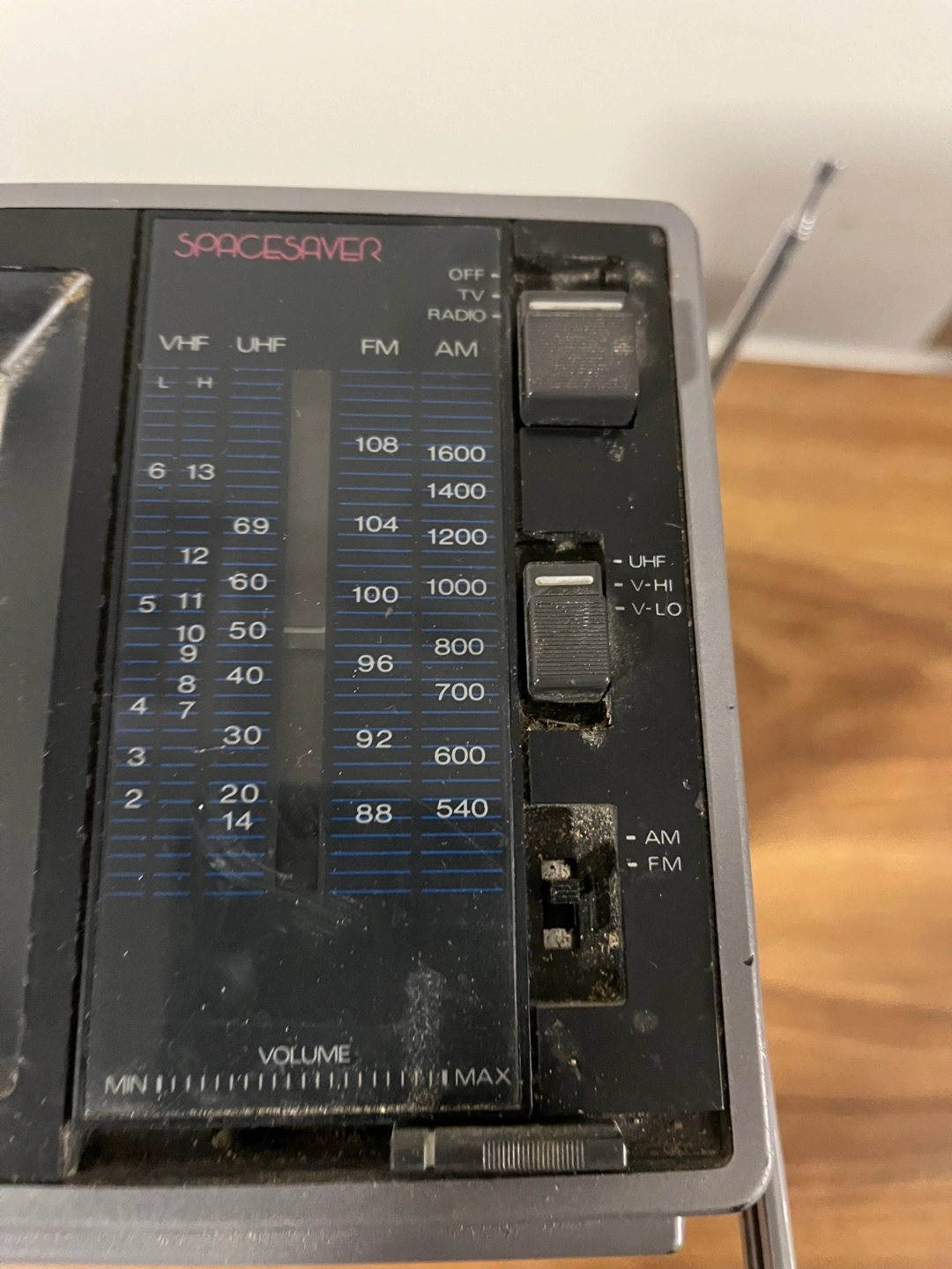 Compact portable TV. Features a SpaceSaver design. Has a handle for carrying. Has a volume dial. Could be fun to watch on a quiet evening.