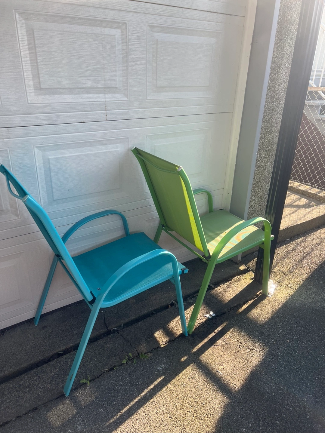 Set of two metal chairs. One chair is turquoise and the other is green. Could be a nice place to sit with a cup of tea and enjoy the sunshine.