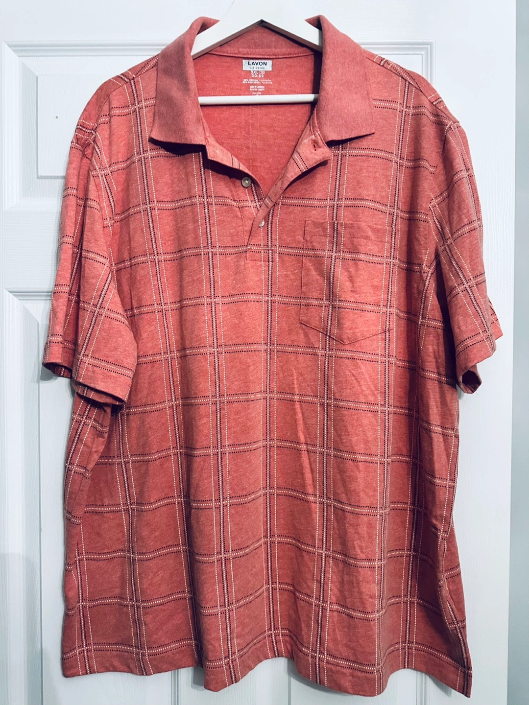 442Plaid pattern in a salmon color. Short sleeves. A breast pocket. Buttoned collar. Perfect to wear on a lazy summer day.