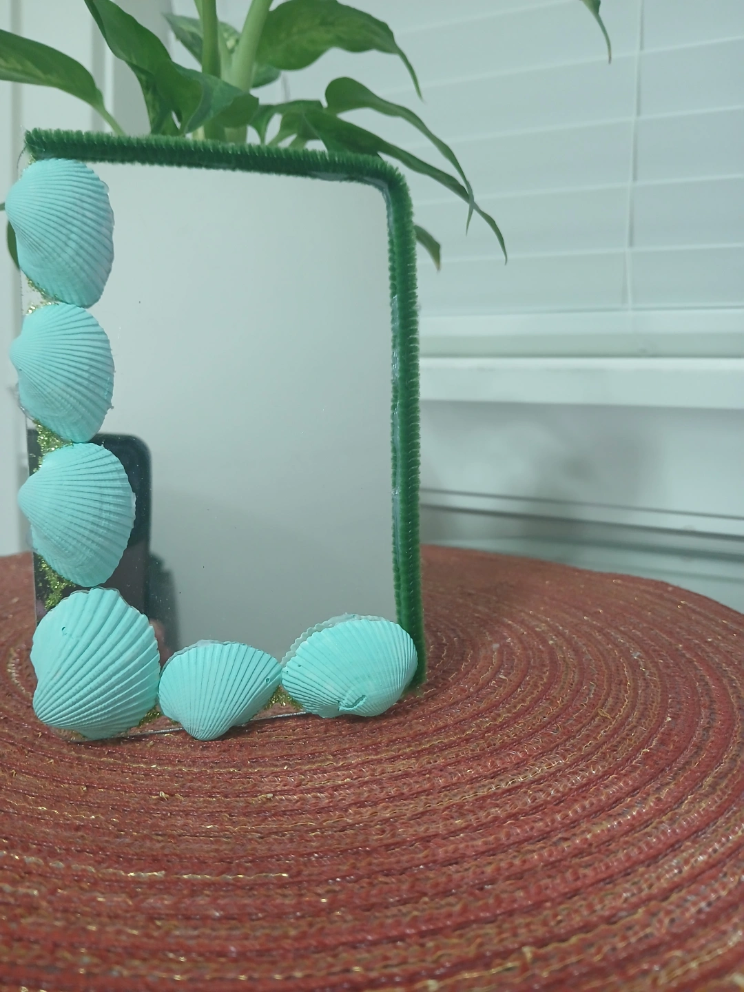 A small, sticking mirror. Framed with green pipe cleaner and painted seashells. The mirror looks lovely on a dresser or vanity for a relaxing ambiance.