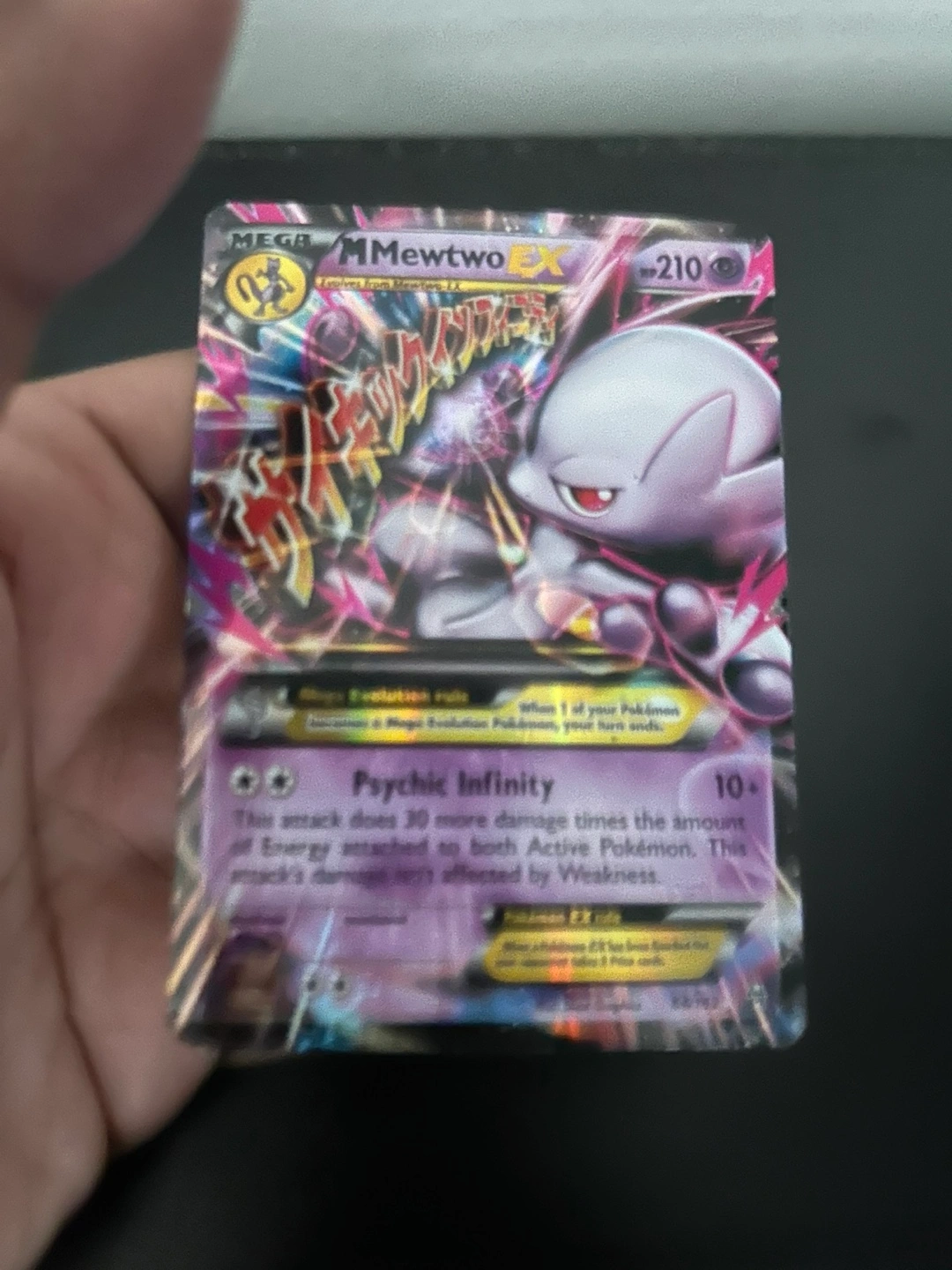 Pokemon trading card featuring a Mega Mewtwo EX. The card shows vibrant colours, including purple and gold. Features a unique design and branding. A great item to add to any collection. 30