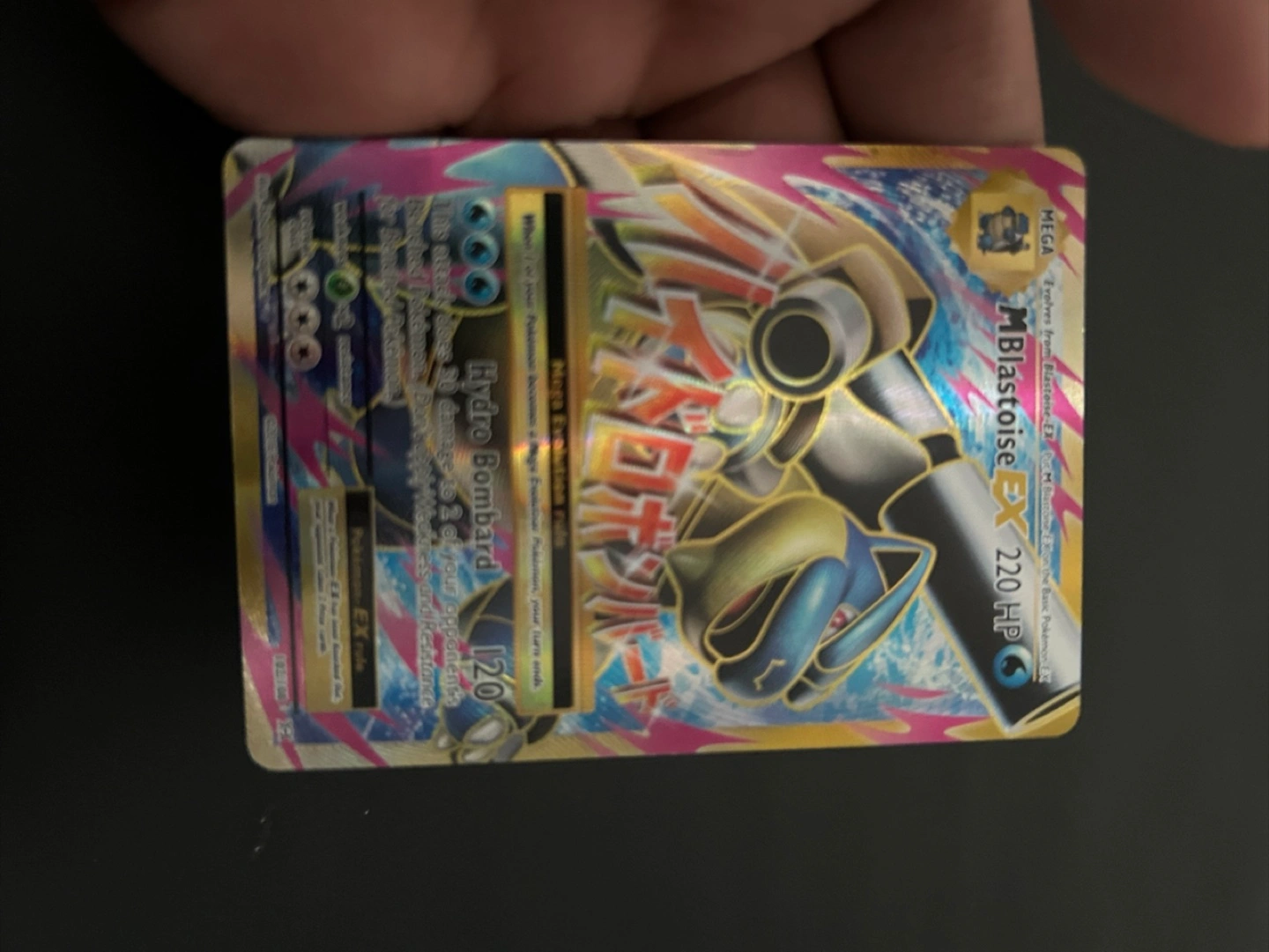 Trading card with a Pokemon character on it. It is a foil card with a Pokemon EX rule. A great addition to any collection, or a pleasant distraction from your day. Blastoise mega