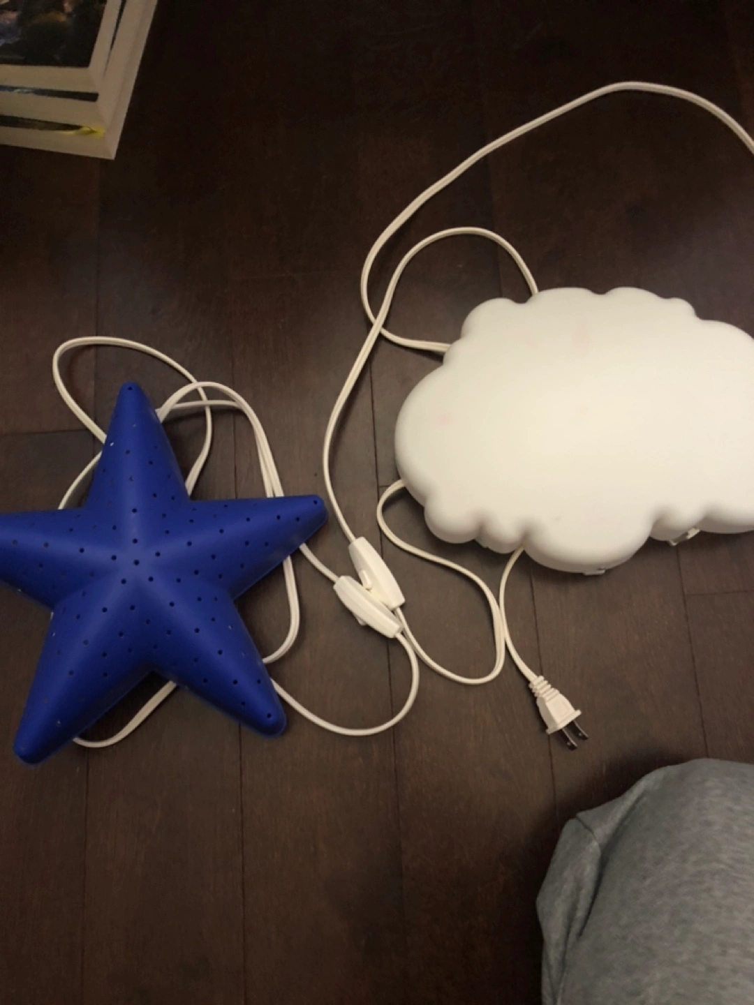 Blue star-shaped night light. White cloud-shaped night light. Both items plug in. A calming light for a relaxing bedtime routine. They also both have switches for easy turn on and off! I believe both are from Ikea.