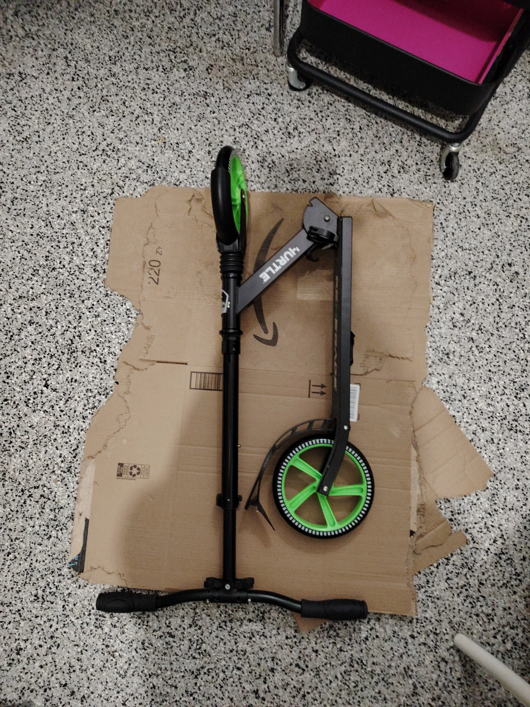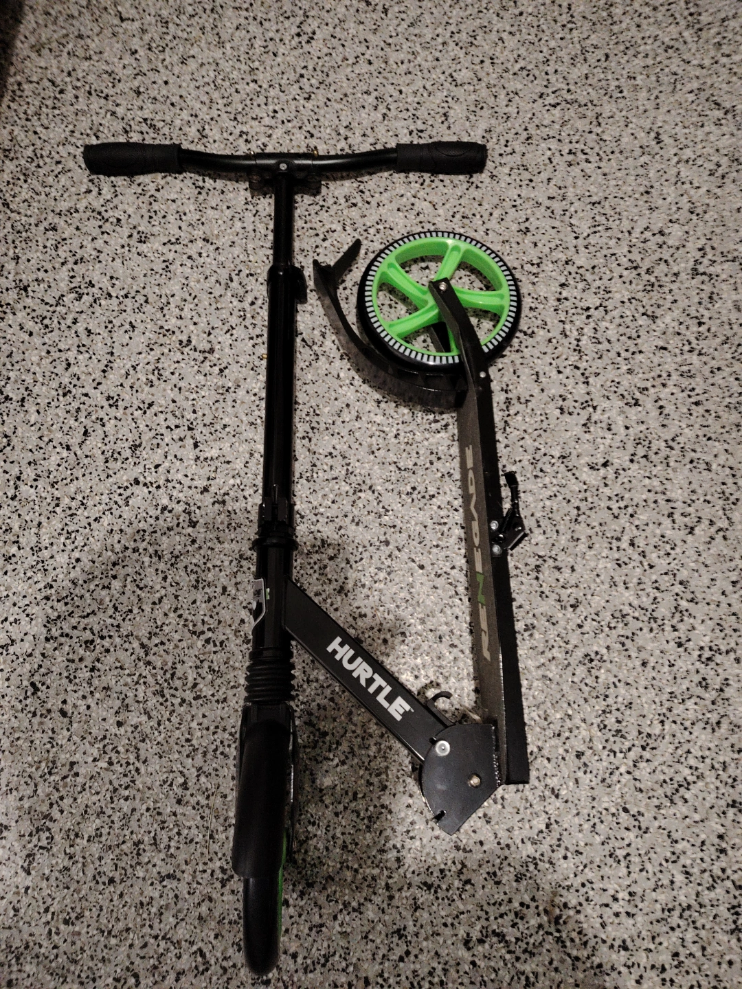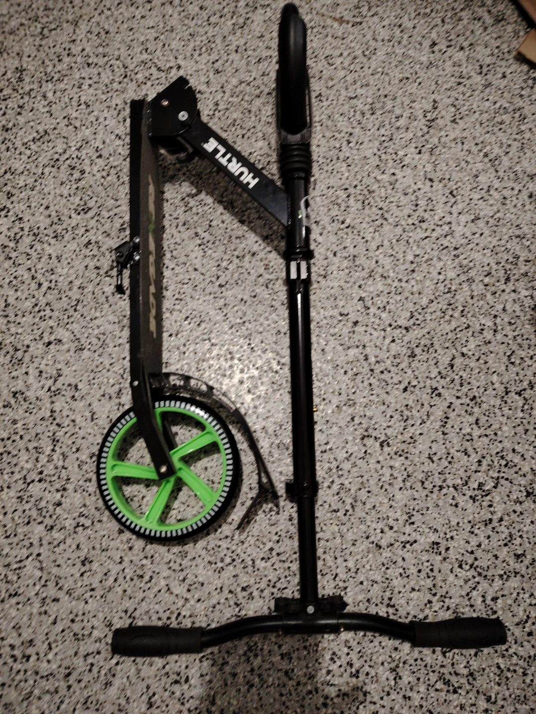 893Features a black frame with green wheels. Adjustable handlebar, and a folding design. Ideal for taking a relaxing cruise in the neighbourhood. Cash only pick up at Erin mill town center mississauga .