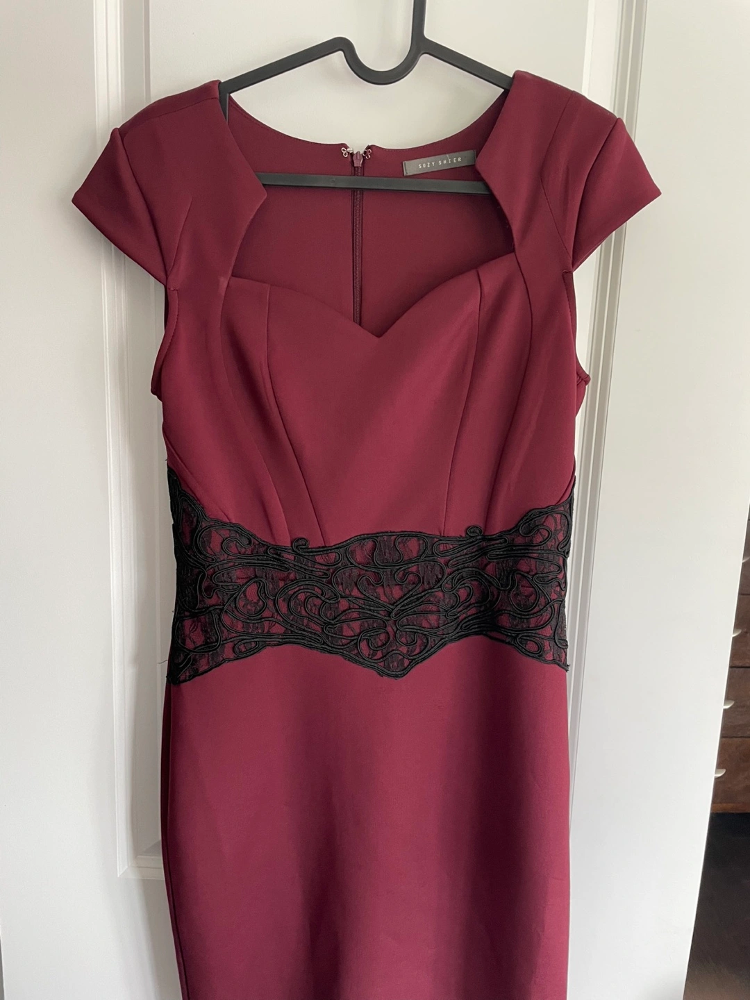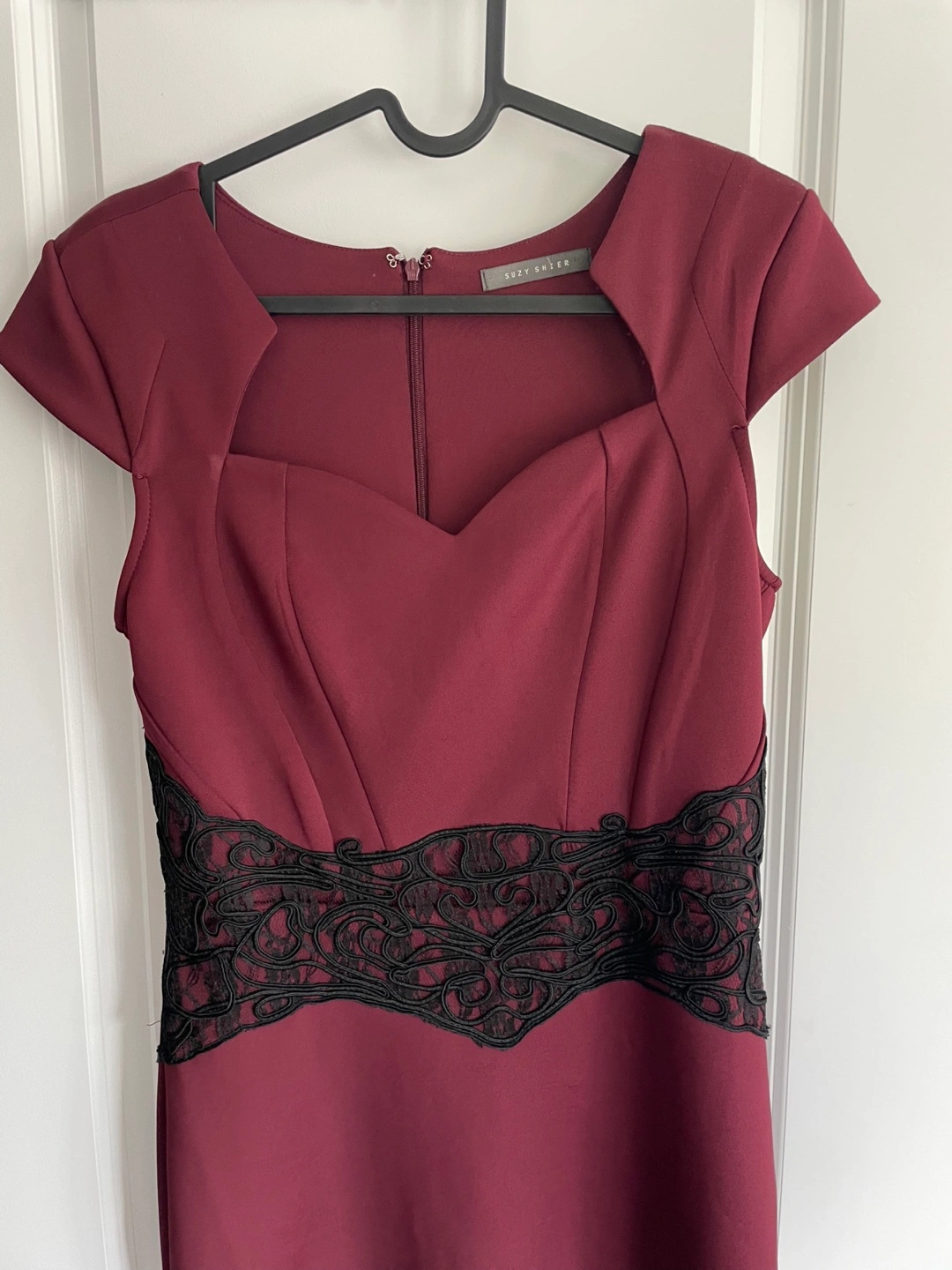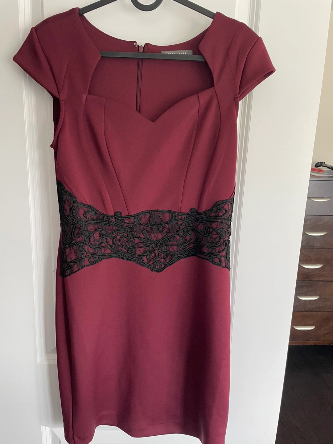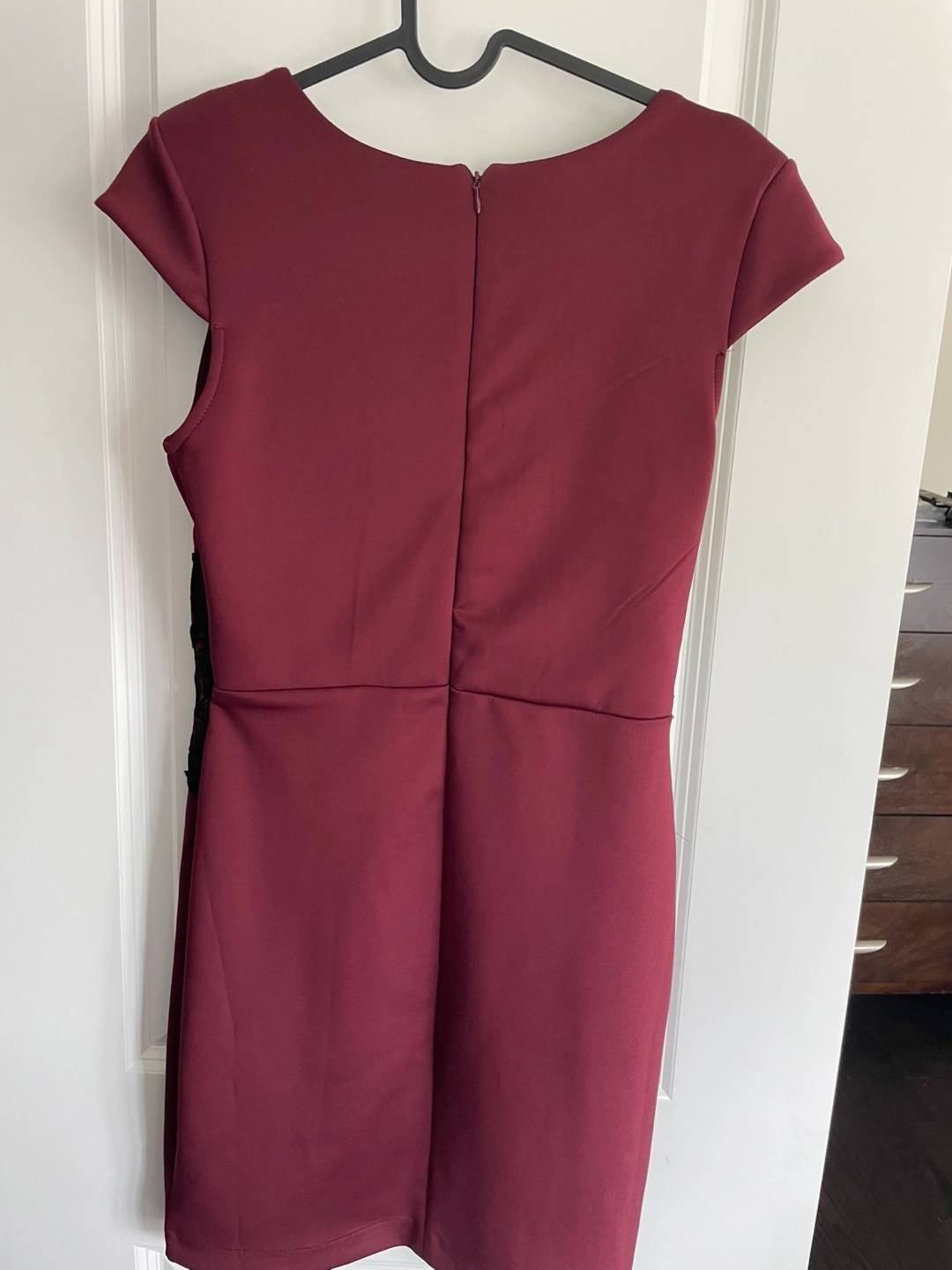 Dress in a burgundy color. Features a scoop neckline. Black lace design on the waist. A nice dress for a night out, helping you feel comfortable and confident.