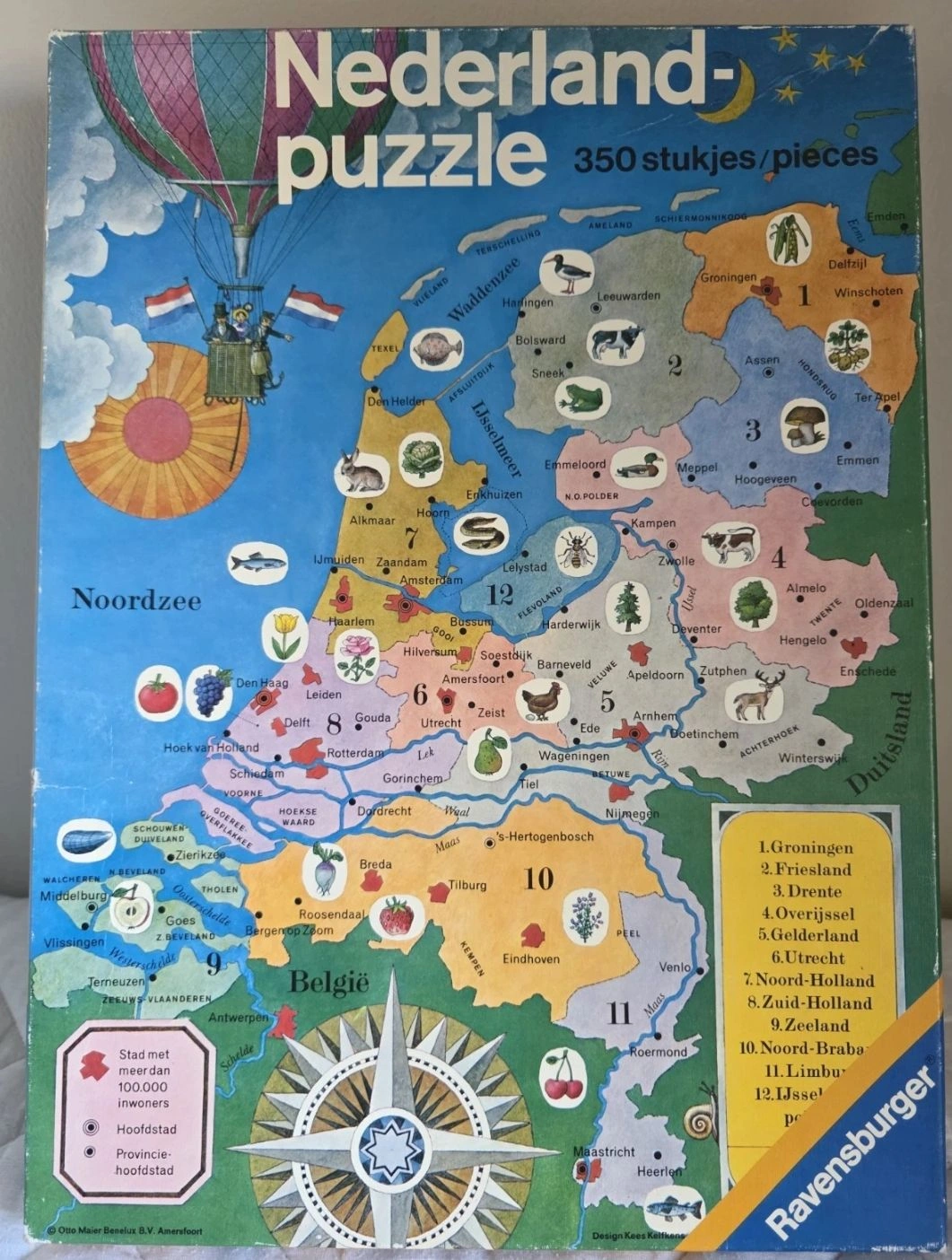 65Vintage 1974 Ravensburger Nederland Puzzle – 350 Pieces – Complete Add a piece of nostalgic charm to your collection with this 1974 Ravensburger Nederland-Puzzle, featuring a beautifully illustrated map of the Netherlands. With 350 precisely cut pieces, this high-quality vintage jigsaw puzzle captures the detail and craftsmanship Ravensburger is known for. Brand: Ravensburger Year: 1974 Title: Nederland-Puzzle Piece Count: 350 (complete) Condition: Complete. The pieces are in very good condition, with no damaged pieces. The box has wear typical with its age but no tears or rips or any other major defects. Dimensions (finished puzzle): 36.2 x 49.3 (cm) Made in Germany Perfect for collectors of vintage puzzles, Dutch memorabilia, or Ravensburger fans. A rare find that offers both a relaxing activity and a display-worthy finished product